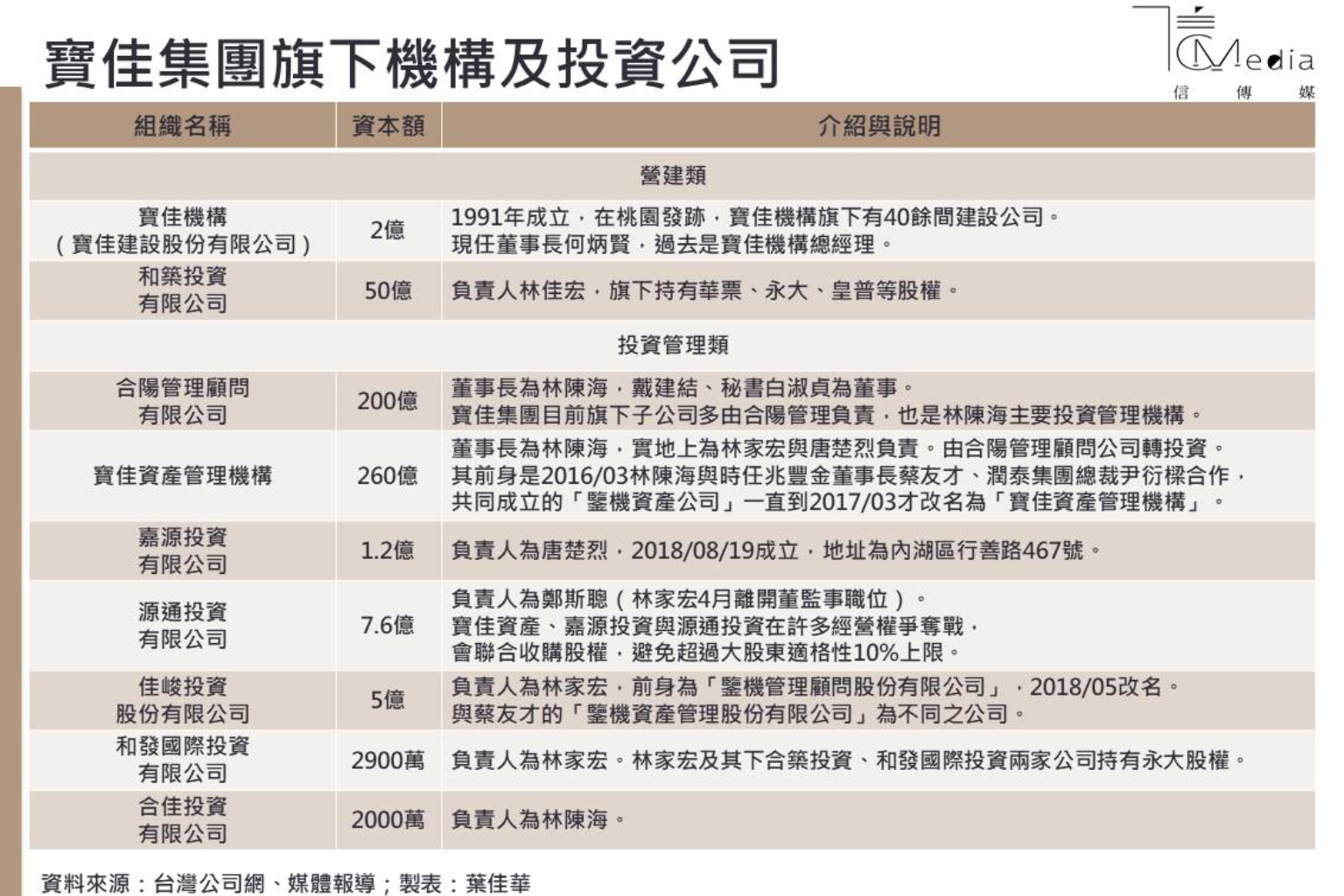 目前林陳海所掛名董事長的投資公司有合陽管理顧問、合佳投資以及寶佳資產管理3家公司,其中,又以合陽管理顧問公司為林陳海的主要投資管理機構,且目前寶佳集團旗下子公司也多由合陽管理負責,包括櫻花建設、台中銀行等,也與寶佳機構的總部地址相同。