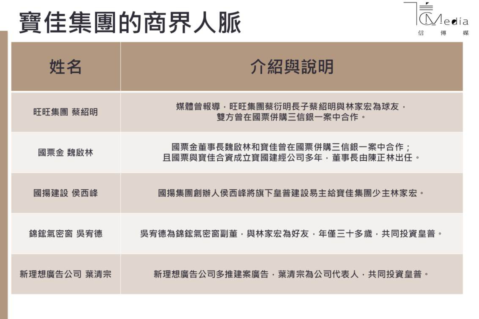從蘇貞昌、鄭文燦到陳冲、蔡哲雄、黃煌雄、蕭長瑞、黃昆輝等人已透露出寶佳林陳海父子的政界人脈;至於寶佳的商界人脈也可從國揚集團創辦人侯西峰將旗下皇普建設易主給林家宏看出端倪,其中包括與林家宏深交十幾年的新理想廣告副總葉清宗、錦鋐氣密窗小開吳宥德等人也都在皇普的合夥人名單之內,成為事業上的夥伴。