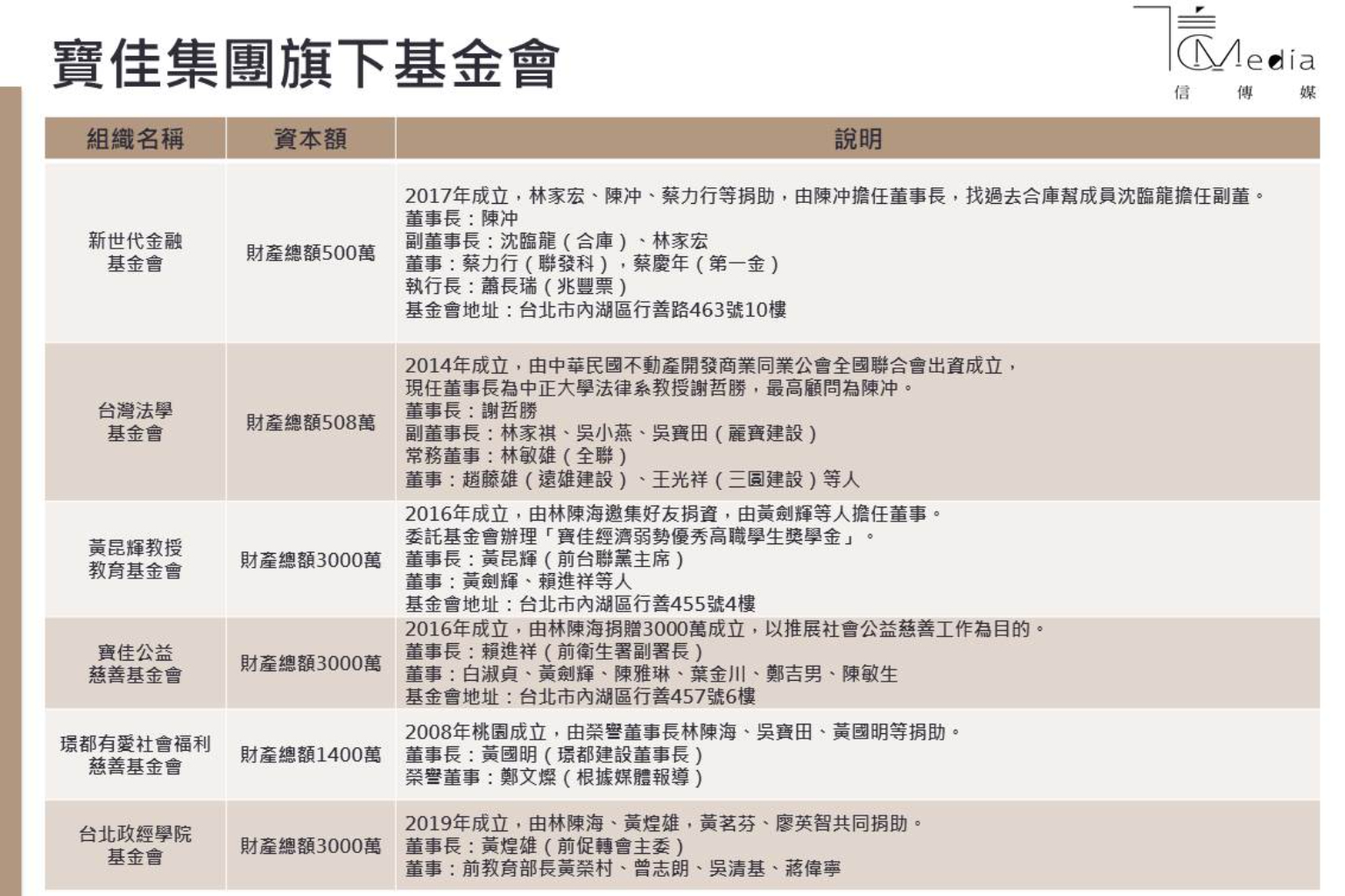 觀察寶佳旗下的重要基金會,其中「財團法人新世代金融基金會」自2017年由林家宏、陳冲、蔡力行等捐助,並由陳冲擔任董事長,同時找上過去合庫幫成員沈臨龍擔任副董事長,董事則分別是聯發科執行長蔡力行、前第一金董座蔡慶年,執行長則是前兆豐票券董座、台灣金控暨台灣銀行總經理蕭長瑞。