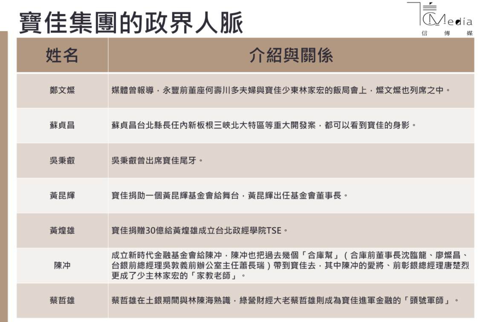 但寶佳集團挾帶著過去在房地產累積的龐大資金,一路揮軍進入股市,跨足金融以及傳產類股,政商關係肯定也少不了。尤其寶佳集團長期與合庫、土地銀行、兆豐往來,政界更是藍綠都有互通,包括寶佳資產管理顧問名單就有綠營金融大老蔡哲雄入列、前行政院長陳冲也擔任旗下基金會的核心人物,甚至人脈中也有現任行政院長蘇貞昌系統的影子。