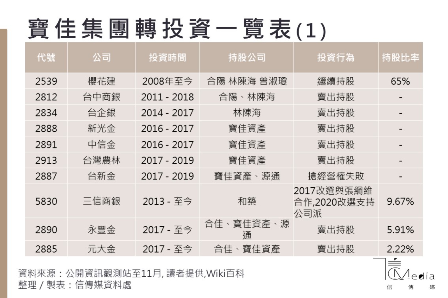 第四、多透過旗下的寶佳資產、嘉源投資與源通投資共同買進持股,以便每個投資機構都低於10%或5%,防止受到金管會「大股東適格性」的規範,減少主管機關關注。