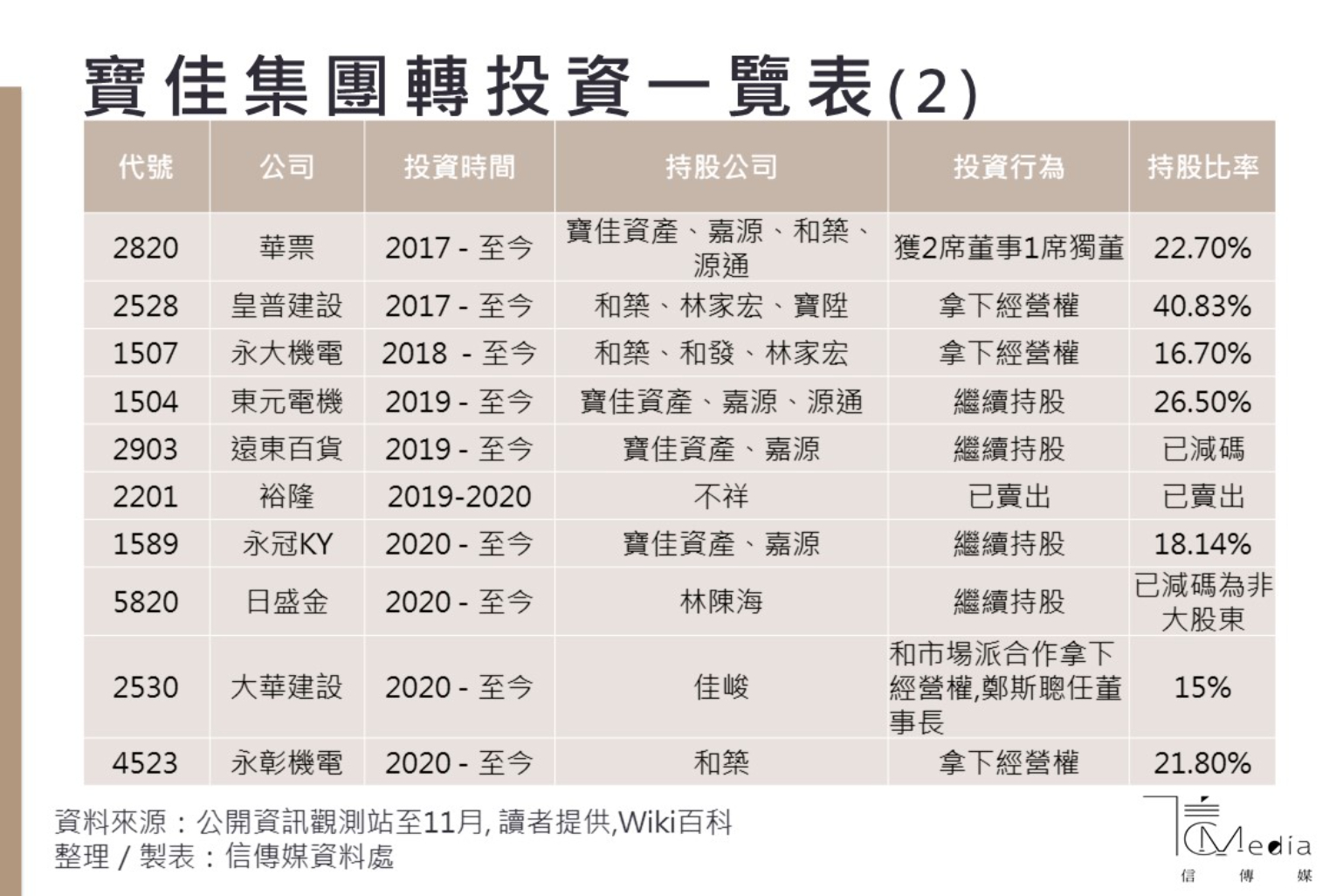 其中,投資部位最大的就是這次涉入坑殺勞退基金弊案的寶佳資產管理股份有限公司,直接持股有華票、東元、遠百、永豐金、永冠KY,其投資部位合計約165億元,主要持股元大金的合佳投資部位約56.8億元,而和築、嘉源分別為49.8億、45億元,入股大華建設的佳峻則在10億元左右。然而隨著公司市值波動,寶佳集團對外持股總市值一度高達530億元。