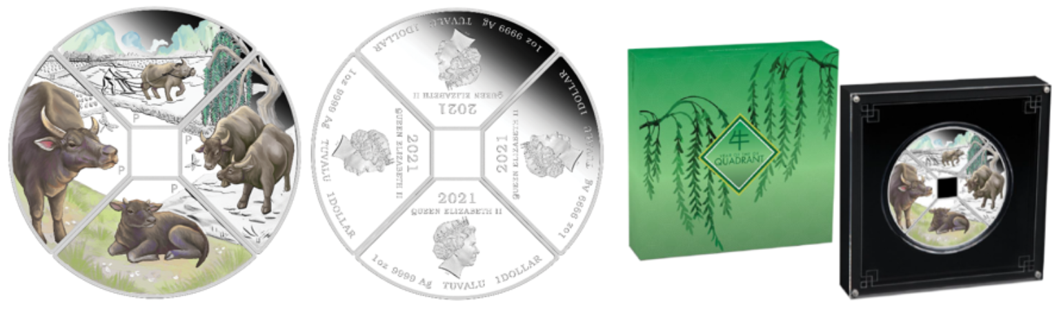 銀幣由4枚1英兩扇形彩色精鑄銀幣組成,幣面呈現不同姿態的牛隻圖案,各寓意「勇往直前」、「齊力合作」、「恣意盎然」、「歡喜自在」,1套售價為14,880元,全球發行量1,500套。