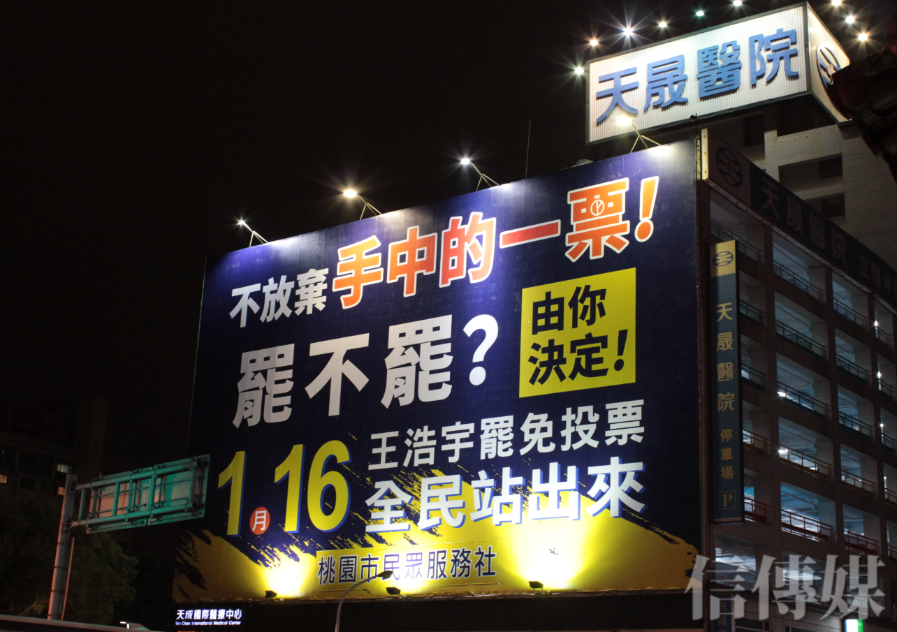 隨著1月16日罷免王浩宇投票日越來越接近,日前「罷王總部」四處洽詢廣告看板位置,但接洽9個卻有7個都碰壁「不敢上架」,直到立委張育美旗下天晟醫院挺身而出,寧願把原本醫院廣告換下,就是要提供全中壢最好的牆面給「罷免王浩宇」。