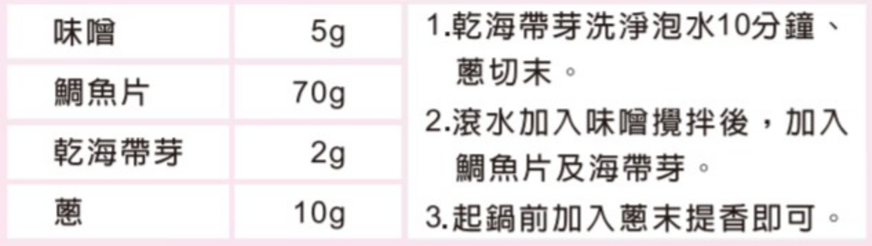 1.海帶芽的含鈉量較高,烹煮前可快速川燙,減少鹽分的攝取,且盡量不要再添加額外的鹽,才可保有魚的鮮味;味噌鈉含量很高(10g含415mg鈉),因為一天鈉建議攝取 量為6g鹽(含2400mg鈉),所以不建議額外添加鹽。