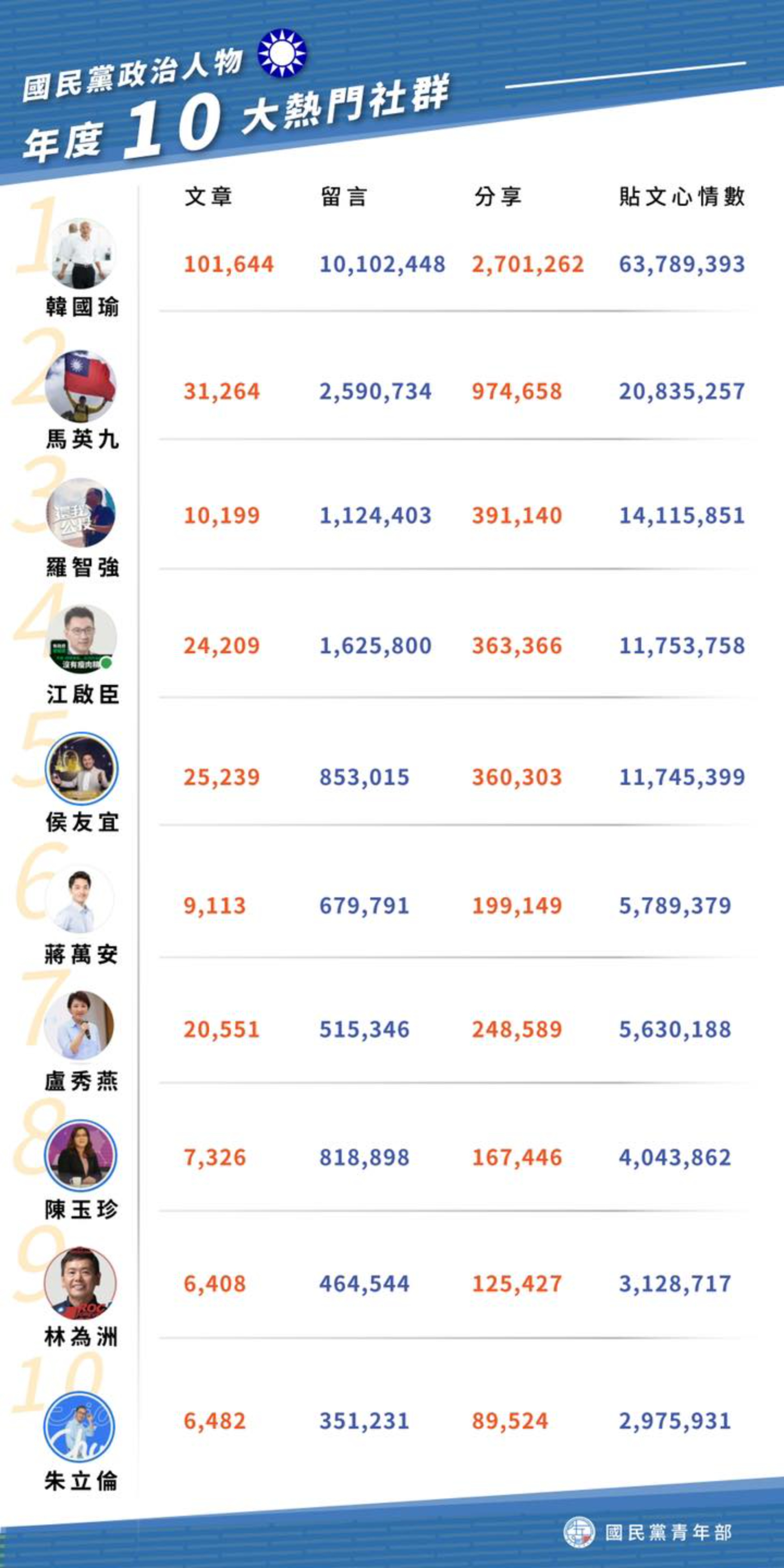 韓國瑜雖然沉潛多時,但根據國民黨青年部的網路大數據調查,韓的聲量不只在國民黨、甚至在全國範圍依然是一枝獨秀,屬於為「S級」的大咖,江啟臣、朱立倫都遠遠落後。