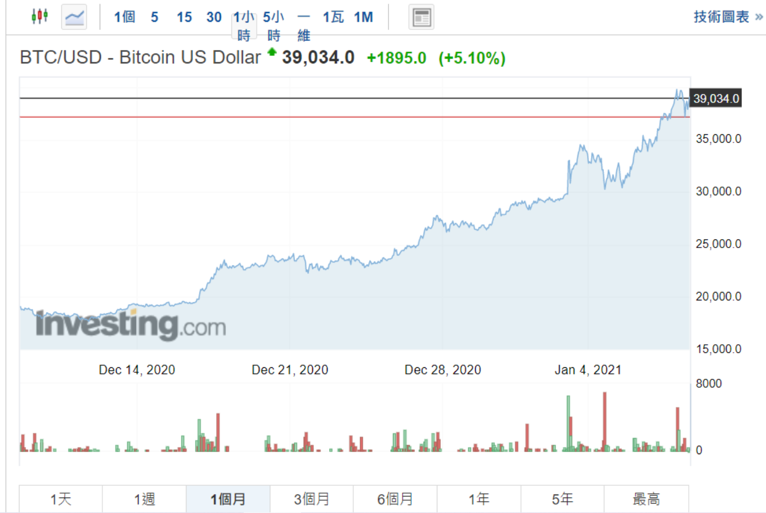 2021年才剛剛開始,不僅台灣護國神山台積電股價屢創新高,電動車特斯拉(Tesla)股價也衝上每股800美元大關,公司市值躍升為美國市值第5大企業,首度超越臉書;除此之外,加密貨幣比特幣在8日凌晨也正式飆破4萬美元,創下歷史新高紀錄,在比特幣在短暫攻頂後,價格即修正下跌,不過截至8日晚間9點半為止,比特幣再度攻上4萬美元,來到4.1萬美元價位上下徘徊。
