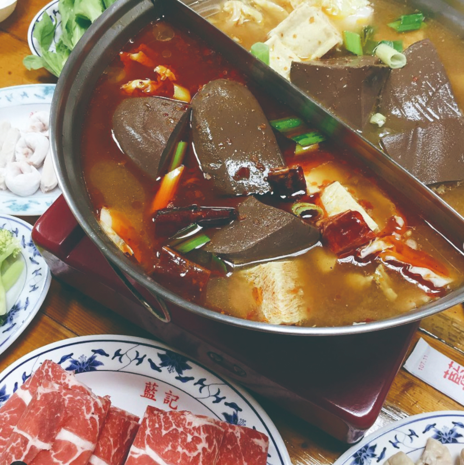 老字號的「藍記麻辣鍋」,湯頭雖較一般麻辣鍋清淡,可直接品飲,但是所費工夫可不馬虎。店家每天以牛骨熬製湯頭,使得清湯厚實香甜,再以辣椒、花椒、胡椒增添紅湯的麻香氣息,不僅能將食材涮得十分入味,溫潤芳香的湯汁更是順口,「藍記的特色之一包括不提供沙茶醬,而是使用店家家傳的祕製辣醬,蘸取涮煮麻辣鍋的食材,讓各種層次的辣味都能在口中澈底發揮。」