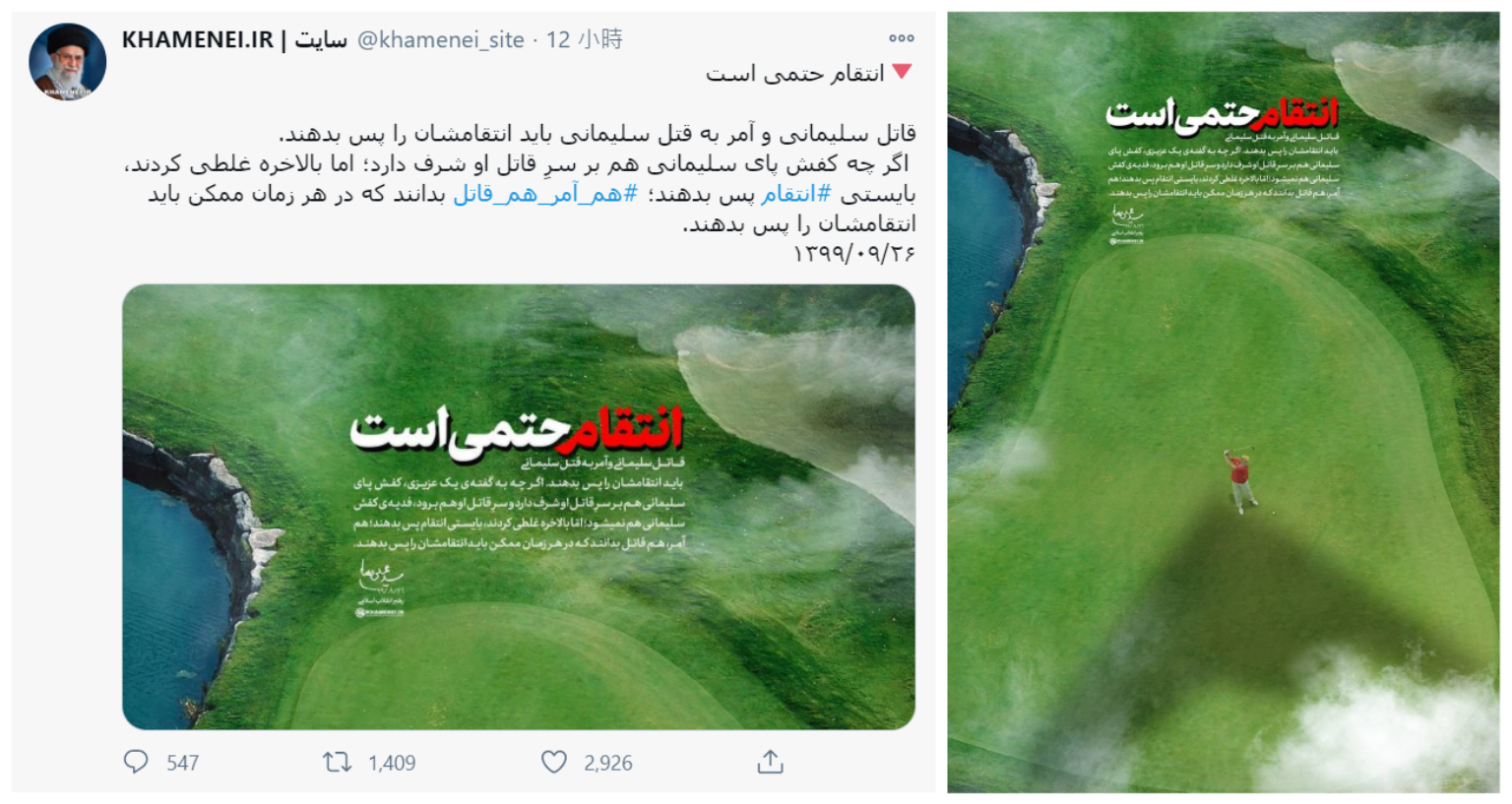 哈米尼在貼文表示,「謀殺伊朗伊斯蘭革命衛隊(IRGC)指揮官蘇雷曼尼(Qassem Soleimani)的人,以及下令謀殺蘇雷曼尼的人,將遭到報復」,他還強調報復隨時都有可能降臨。