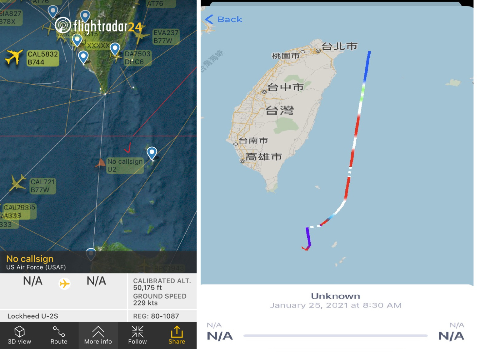 25日早上台灣西南海域就出現貴客,一架美軍U2偵查機最早8點多出現在台灣東北角外海,以約1萬5千公尺、防空飛彈射距之外的高度,沿著東部往南飛,10點多出現在東南海域,接再轉往南海方向,並在兩套追蹤飛機軟體Flightrader 24和Plane Finder都留下了軌跡,但後來該飛機關閉識別碼後,便不知去向。