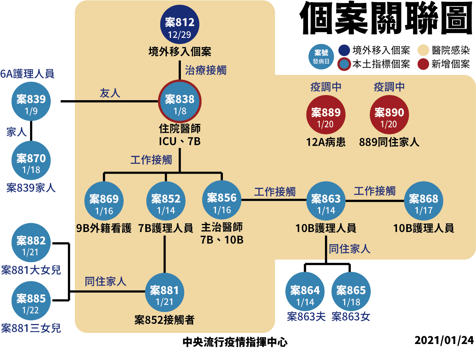 也因昨日新增的案889、案890感染源不明,中央流行疫情指揮中心昨晚緊急宣布擴大回溯醫院接觸者,針對1月6日至1月19日於該院的出院病患及其同住者、陪病者及其同住者、案889就醫時之相關接觸者,即日起全數列入居家隔離至出院後14天,居家隔離的人數也從1300多人增加至5000人,並將桃醫醫療大樓全部升級為「紅區」。