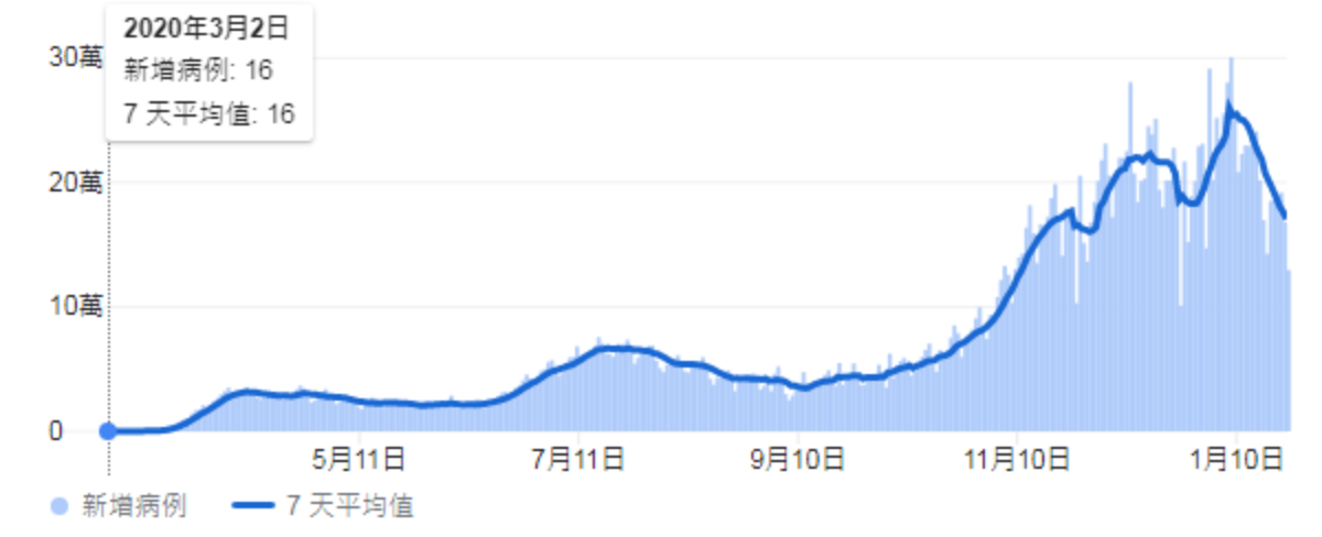 美國方面,儘管感染病例突破2500萬大關,死亡超過41萬人,但好消息是,新增確診人數在1月9日超過25萬,達到頂峰後,開始急速下降,24日新增確診降至17萬,這似乎反映史上最大的疫苗接種運動已經有些成效。