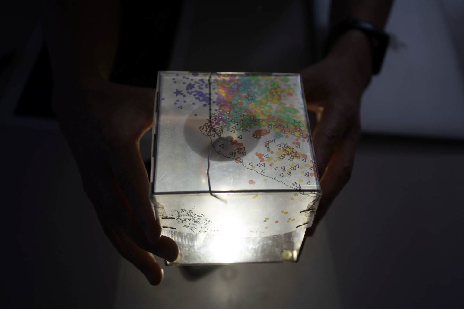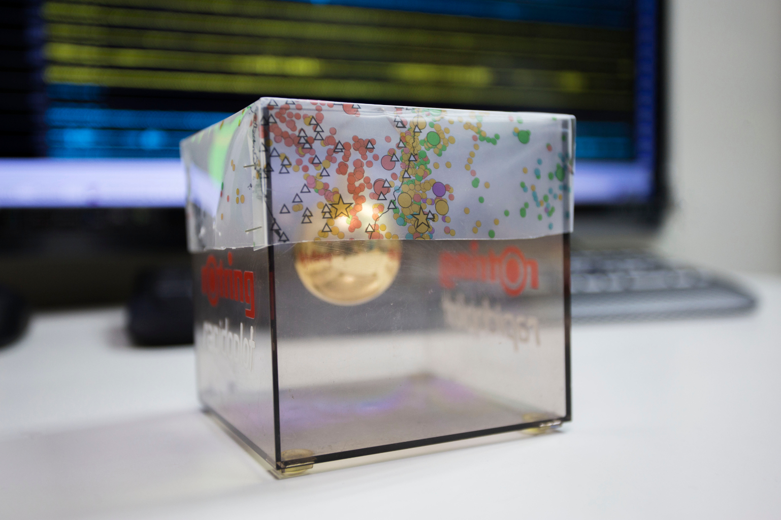 這時可以在盒子底下放手機,讓手機的光向上照,光被盒內金球擋住,盒子上方就會出現金球的陰影。如此一來,不但知道盒子裡有金球,還能從陰影推知金球的位置和面積。