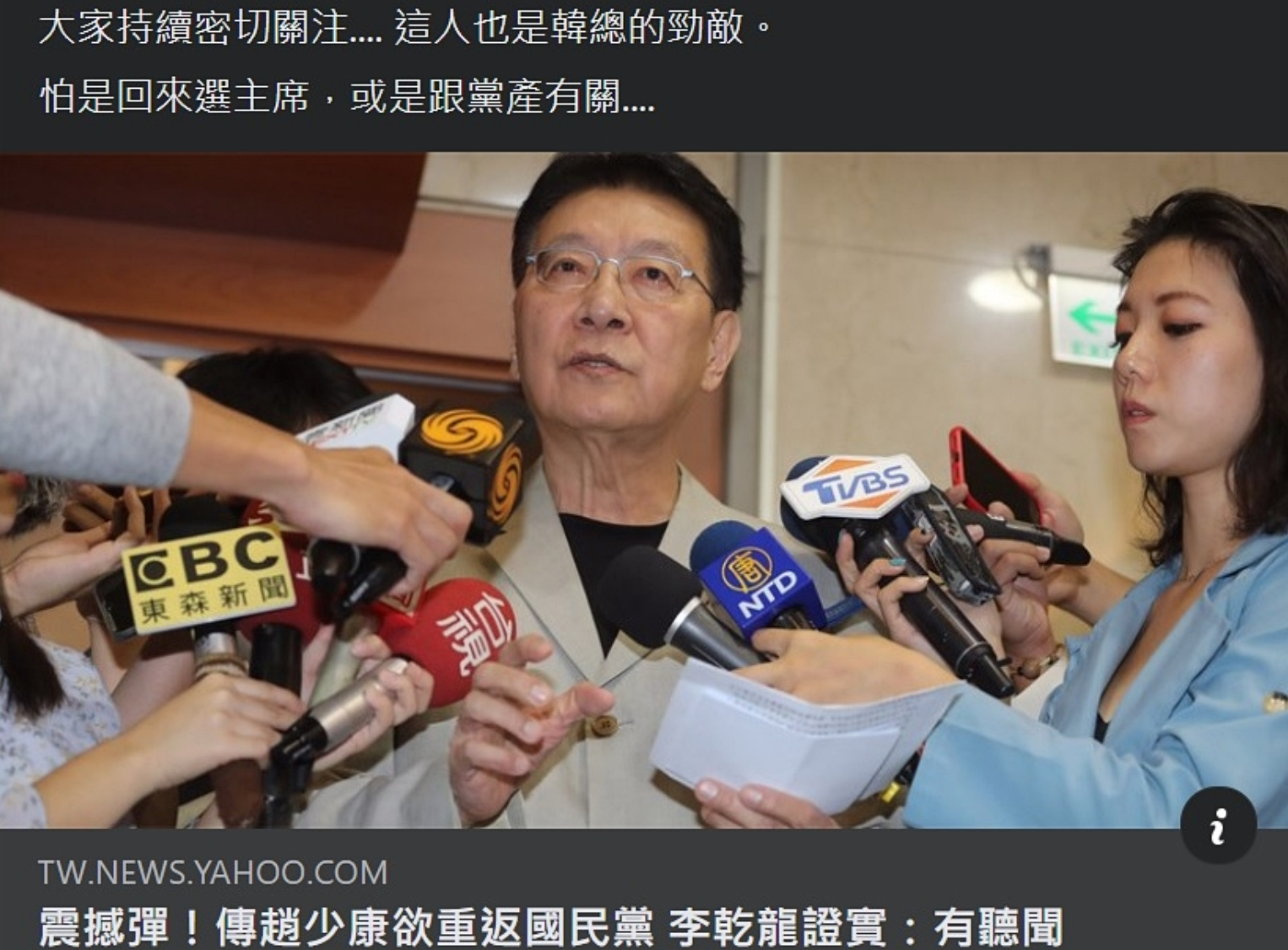 趙少康昨天上午表態重返國民黨,亦不排除「先攻主席再取總統」,還透露自己是受到韓國瑜的勸進,才做出決定;韓國瑜本人則於昨天中午時分在臉書刊文力挺。