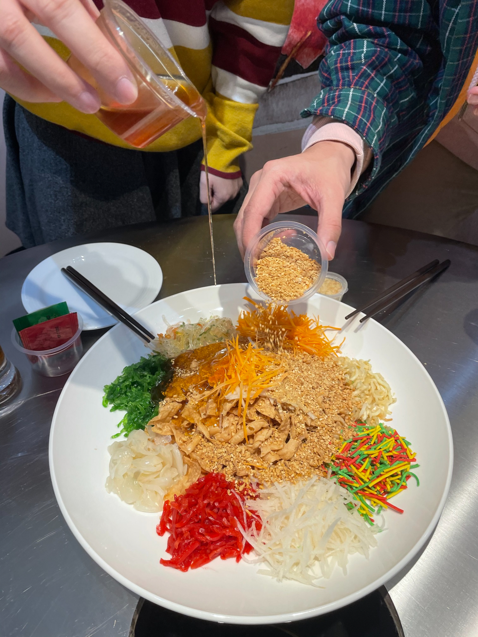 「發!發!年年有餘!」「撈起!風生水起!」西西歪開心地用筷子把食物撈起來,並且高喊吉祥話語,他表示,據說食物撈越高、喊得越熱烈,就越有好彩頭。