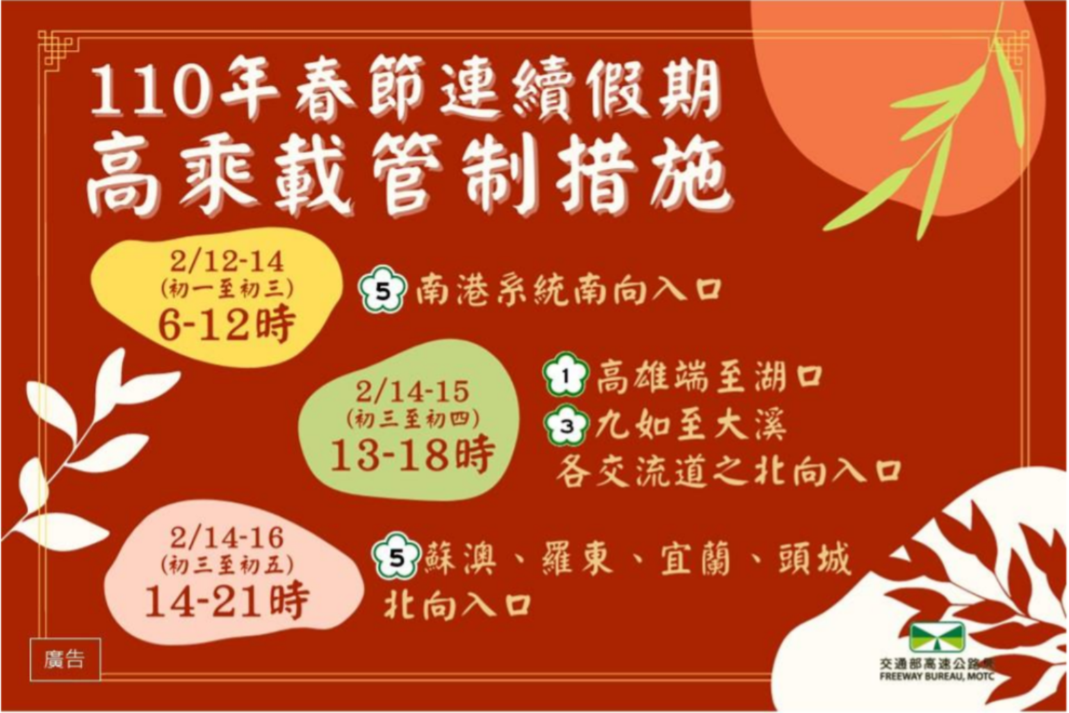 二、2月14~16日(初三至初五),每日14至21時,國5蘇澳至頭城各交流道之北向入口(結束時間視交通狀況機動調整)。