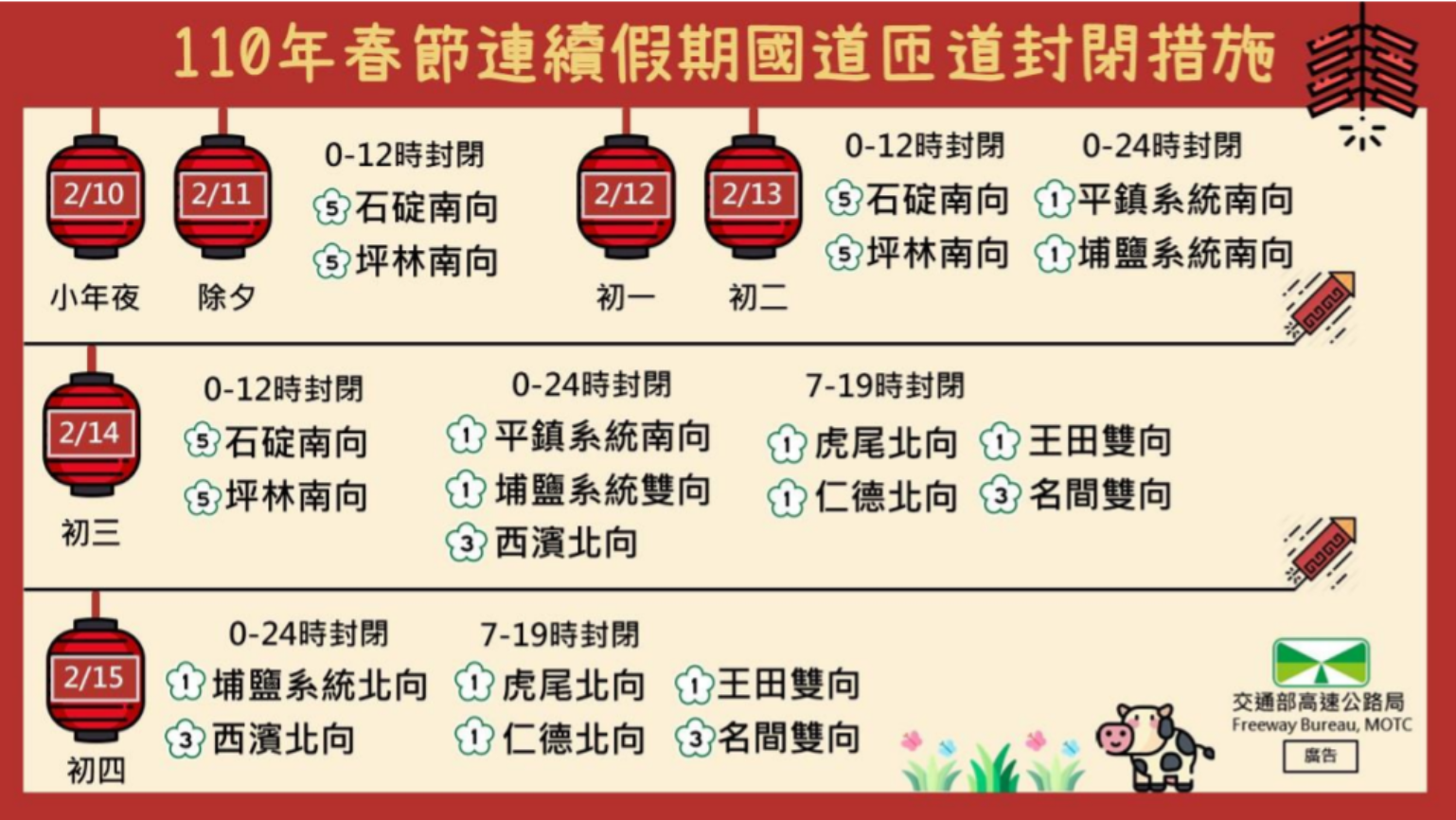 四、2月14及15日(初三、初四),每日7至19時,封閉國1虎尾、仁德北向入口;國1王田、國3名間雙向入口。