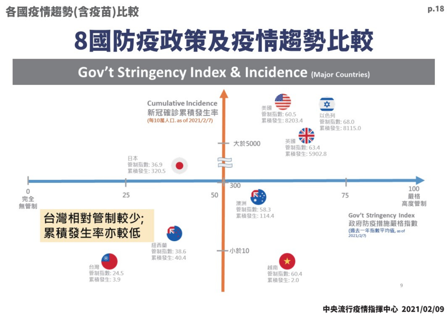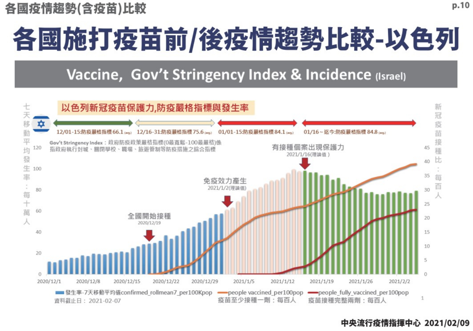 陳時中也以各國施打疫前後疫情趨勢為例,指出如以色列是全球接種率最高的國家,但疫情發生率卻直到防疫嚴格指標提升後才下降;法國也有打疫苗,效力卻因防疫嚴格指標降低而出現抵銷的狀況。並提到,「台灣(防疫)相對沒那麼嚴格,但一樣可以達到很好的效果,因為防疫還關係到執行的有效性和人民的配合度。」