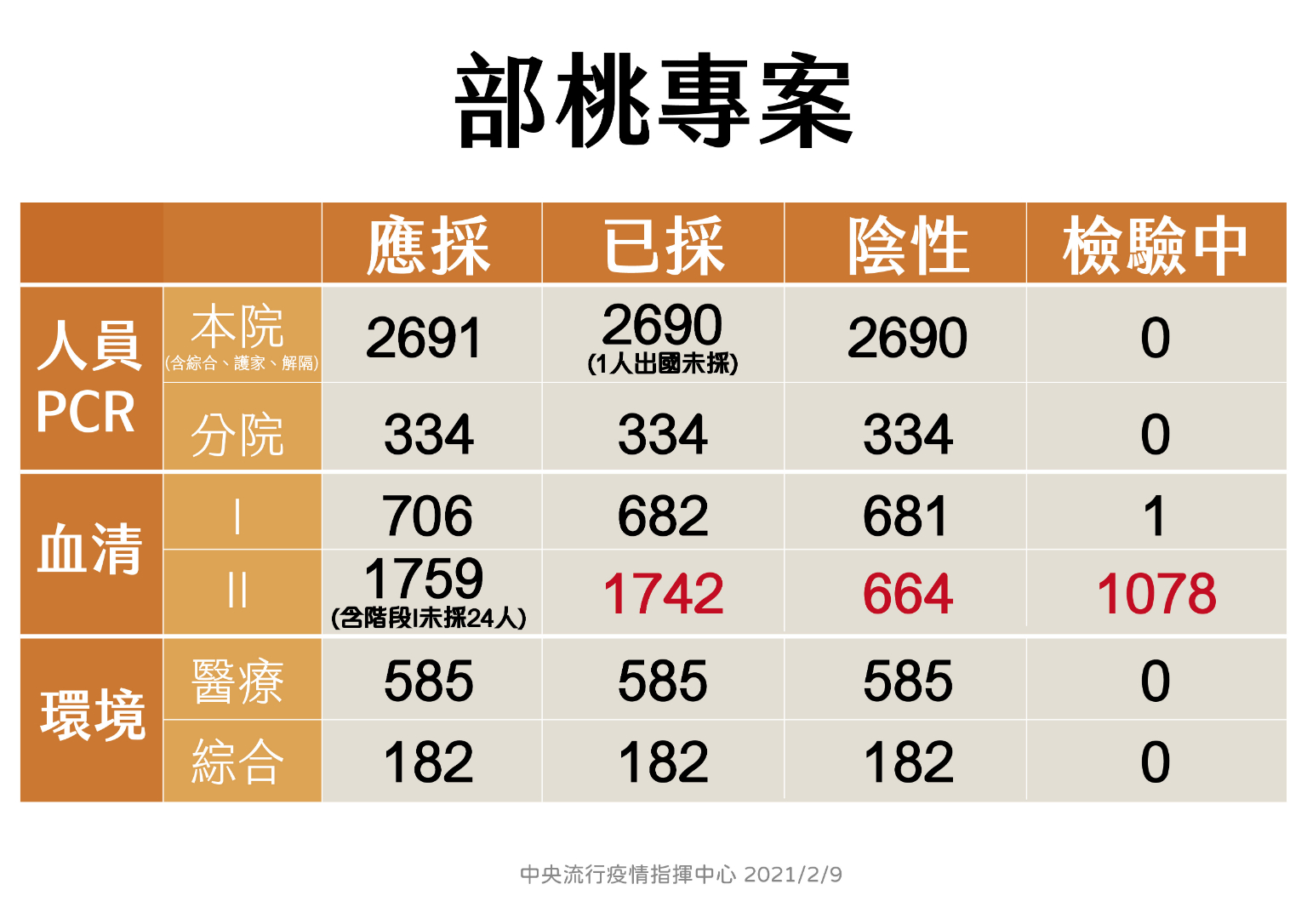 指揮中心今日也表示,因應衛生福利部桃園醫院院內感染群聚事件,於1月27日至2月9日,實施北北桃地區所轄醫院門禁管制措施,除例外情形外,停止開放探病。鑒於指揮中心啟動擴大回溯醫院相關接觸者居家隔離,及部桃清零計畫等措施後,評估該院及社區感染風險降低,因此北北桃地區所轄醫院自明(10)日起,回歸現行陪探病機制。