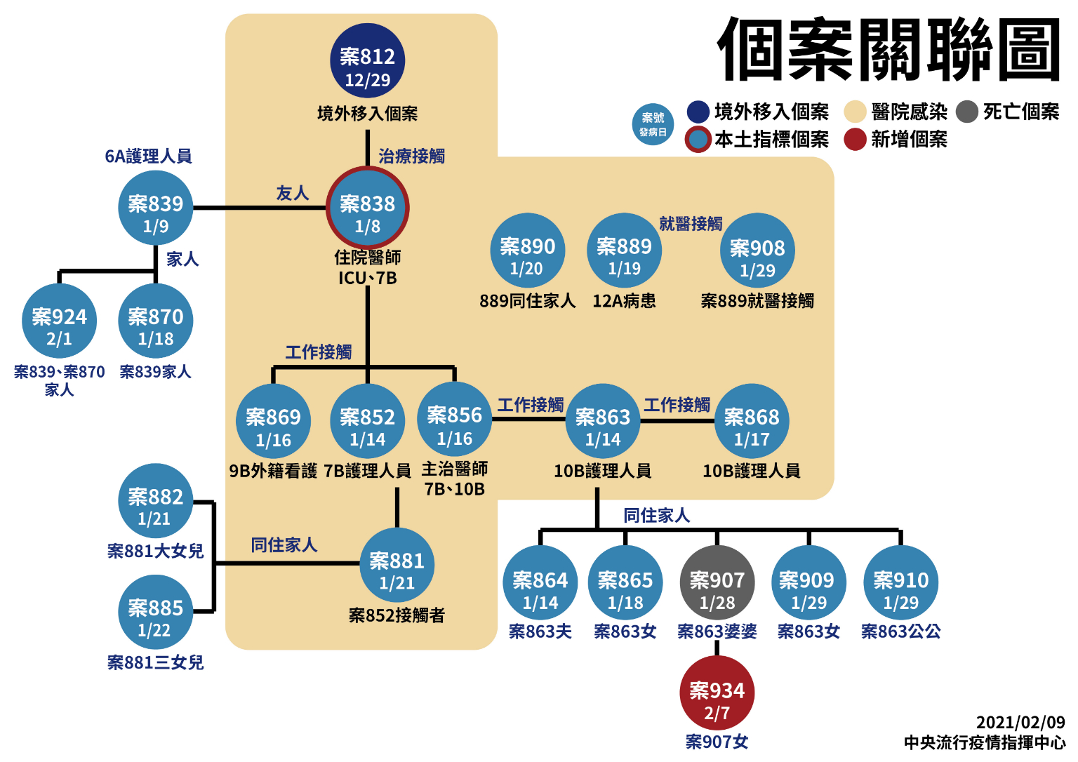 指揮中心指揮官陳時中表示,案934為本國籍50多歲女性,為已故案907婆婆的女兒,因匡列為案864、907、909及910之接觸者,自1月19日起進行居家隔離,隔離期間曾接受5次採檢,結果皆為陰性;個案2月7日曾出現發燒、鼻涕倒流情形,2月8日自覺已無症狀,因申請外出奔喪,由衛生單位安排至醫院採檢,於今日確診。