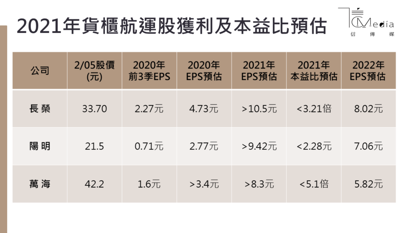 傳產股則以貨櫃航運的長榮、陽明、萬海為高獲利成長主角,雖然近期貨櫃航運股股價漲多出現大幅回跌頗重,籌碼凌亂使然,包含長榮47萬張ECB轉換的外資賣壓,但封關當周末長榮ECB只剩6萬張未轉換。但是,著眼於它們是今年全台股當中本益比最低的股票,僅有2~5倍左右,也可能是全球本益比最低的股票,預期未來股價將會表現在獲利數字的呈現。