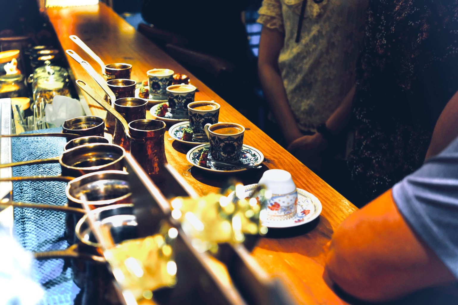 土耳其咖啡是世界上最早流行的純咖啡式飲品,將極其細緻的咖啡粉加水並倒入伊芙利克銅壺,在將近攝氏300 度的砂爐上游移,透過熱能傳導烹煮,不需過濾即可直接享用咖啡的焦香油脂與厚實口感。