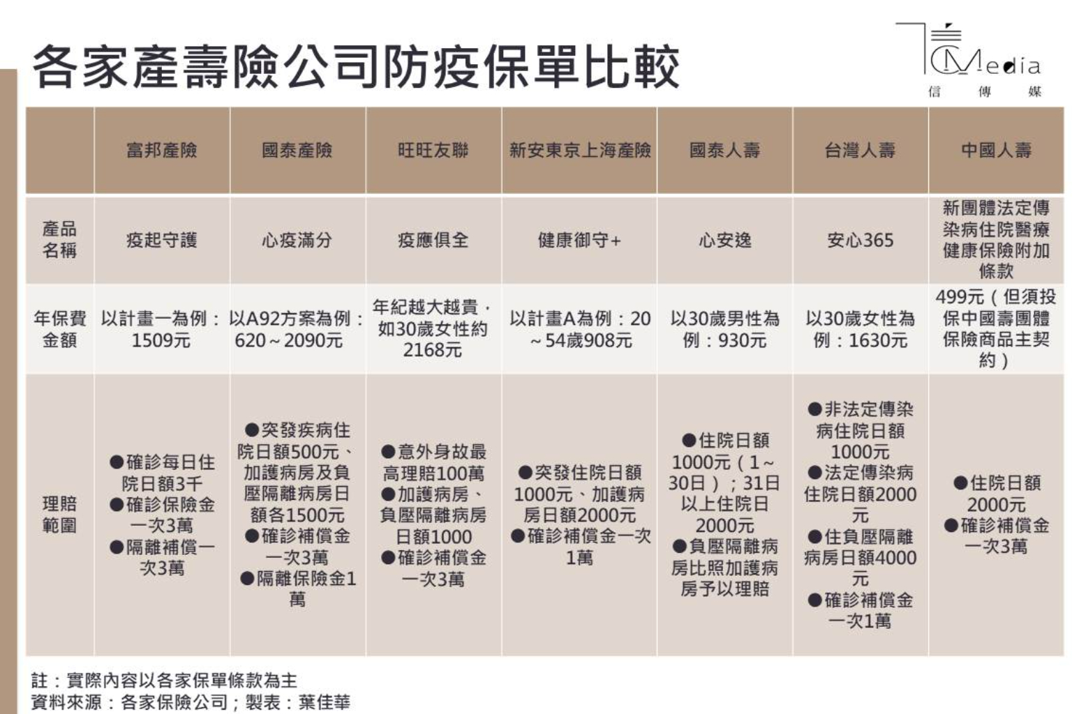 攤開目前由產險、壽險公司分別所推出的防疫保單內容,其中大多是都是針對法定傳染病所設計的健康保險,內容大多涵蓋至住院治療,因此民眾若因為施打疫苗所衍生副作用導致住院,防疫保單還是多少能有保障。