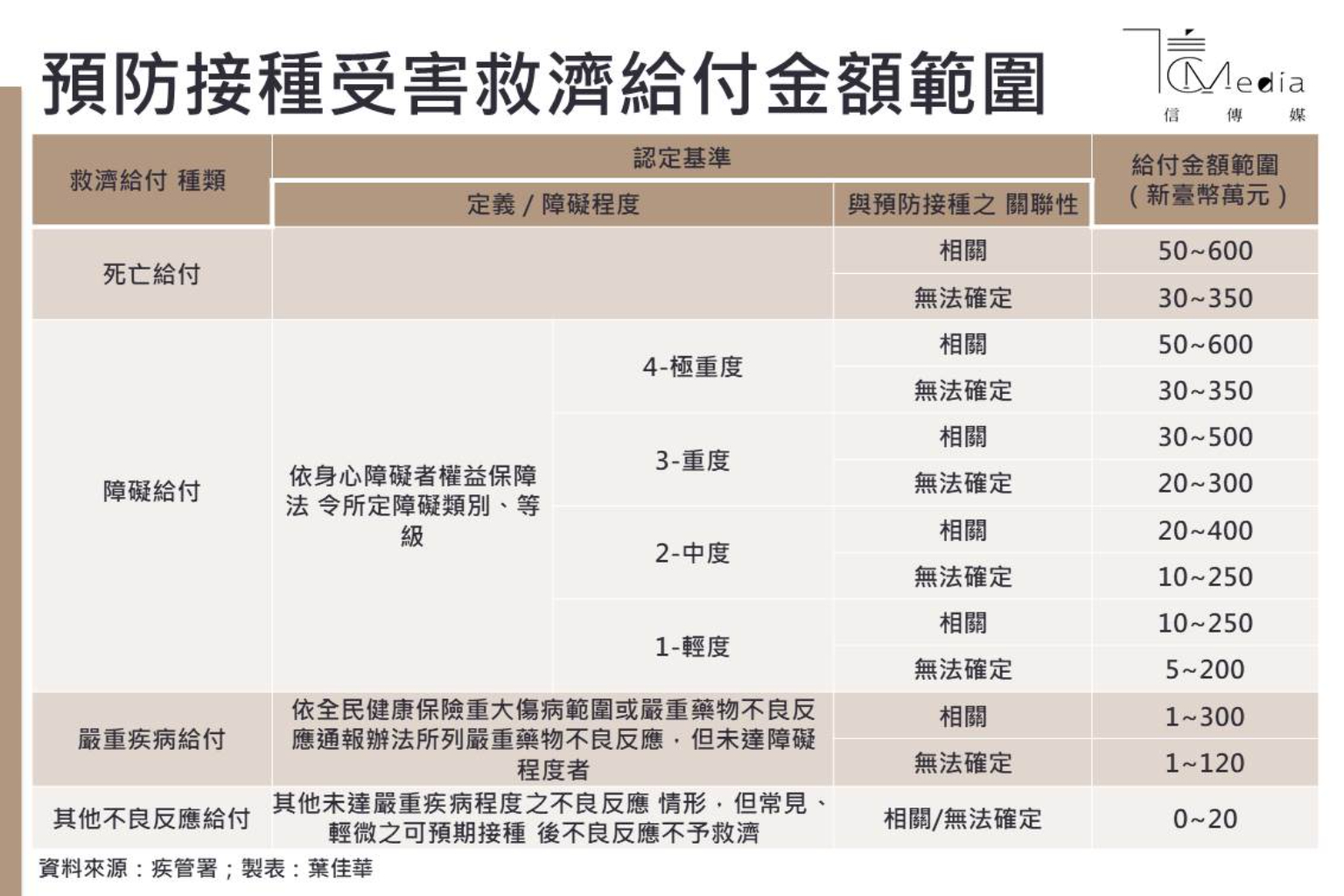根據衛福部所公布的預防接種受害救濟給付金額範圍,給付分死亡、障礙、嚴重疾病及其他不良反應4種類。其中,死亡及極重度障礙最高600萬元,無法確定與接種闗聯者為350萬元,其次障礙給付分重度、中度和輕度,最高分別可獲500萬元、400萬元以及250萬元。
