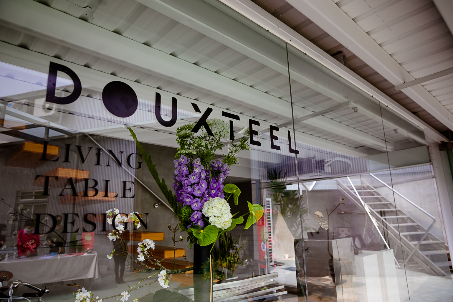 開車要彎進義林路小小的巷子,著實需要鼓起勇氣,然而一旦穿過狹窄巷口,除了逐漸開闊的行車道路之外,迎面而來的是座落在工廠門口,帶有白色簡約美學的鐵皮屋建築。一樓大面積落地玻璃,自信的展示著Douxteel 品牌作品,二樓則設定為稍微隱密的展示與招待空間。