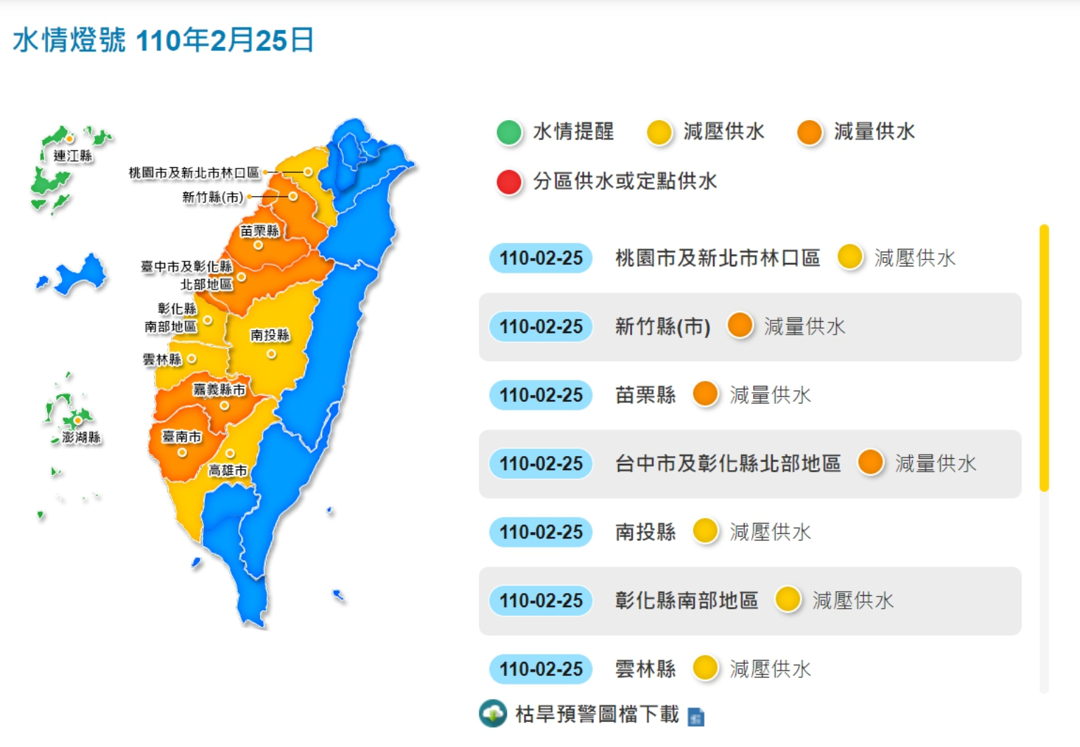 除了擴大自來水減壓時段由晚上10點至次日6時延長至全日實施外,非工業大用水戶、游泳池、洗車、三溫暖節水率也從10%提高至20%,而工業大用水戶則自2月25日起減量供水節水率目標提升至11%。