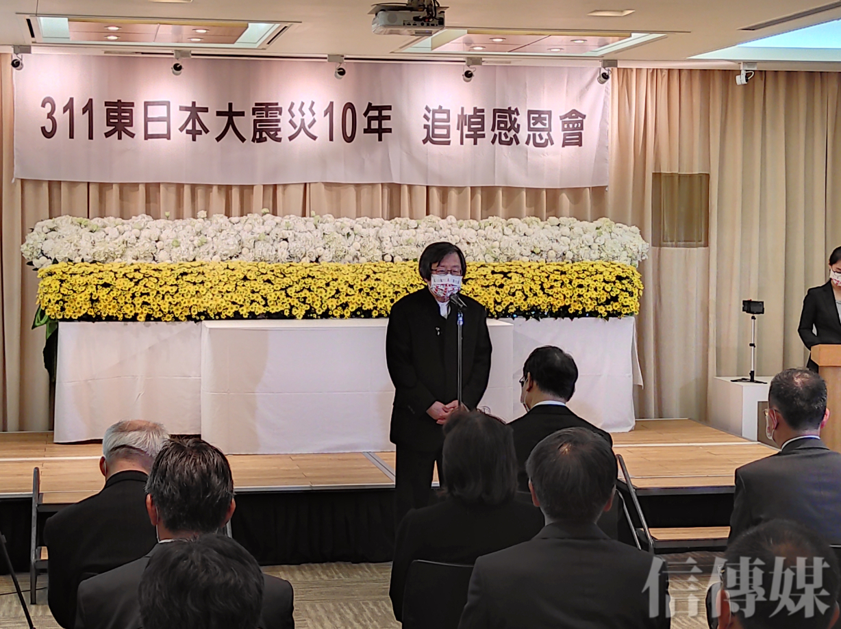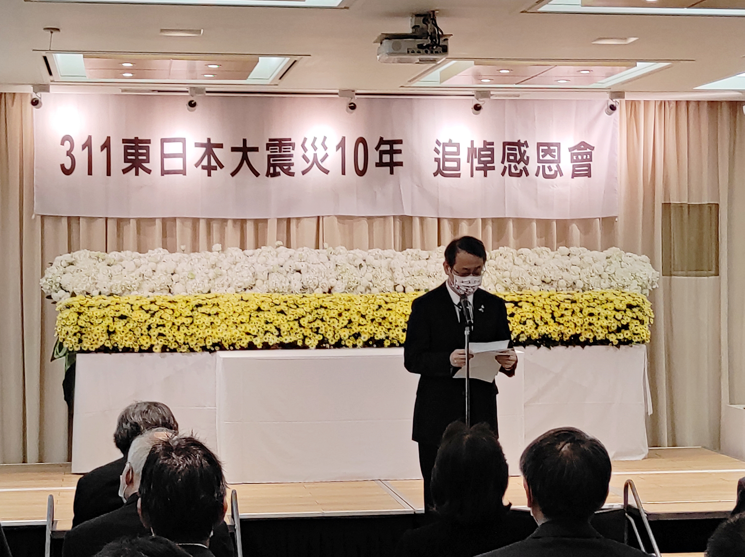 駐台代表泉裕泰在追悼感恩會致詞表示,10年前的今天,發生了芮氏規模9.0的東日本大地震,在此對震災中不幸犧牲的罹難者表示衷心的哀悼,並要向當時大力支援我們的台灣朋友們再次表達感謝之意。