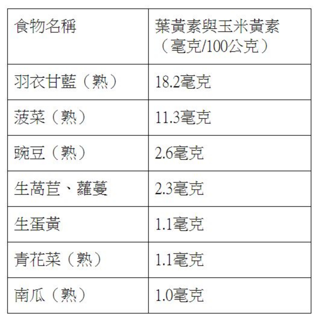 1. 葉黃素與玉米黃素:為天然抗氧化劑,根據研究指出一日攝取6-10毫克,可降低老年黃斑部病變的風險。食物來源為深綠色蔬菜、紅橙黃色蔬果及蛋黃(含量如下表),其中蛋黃因富含脂肪,生物利用率較其他蔬果高,故仍為良好的食物來源。