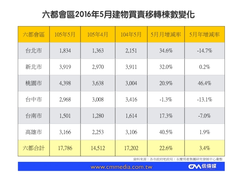 6月1日發布的六都會區「5月份建物買賣移轉棟數」顯示,交易量最大為桃園市4,398戶,最少則是台南市1,501戶,六都合計17,786戶,和4月相比,量增22.6%。但和2015年同期相比則是減少減21%。