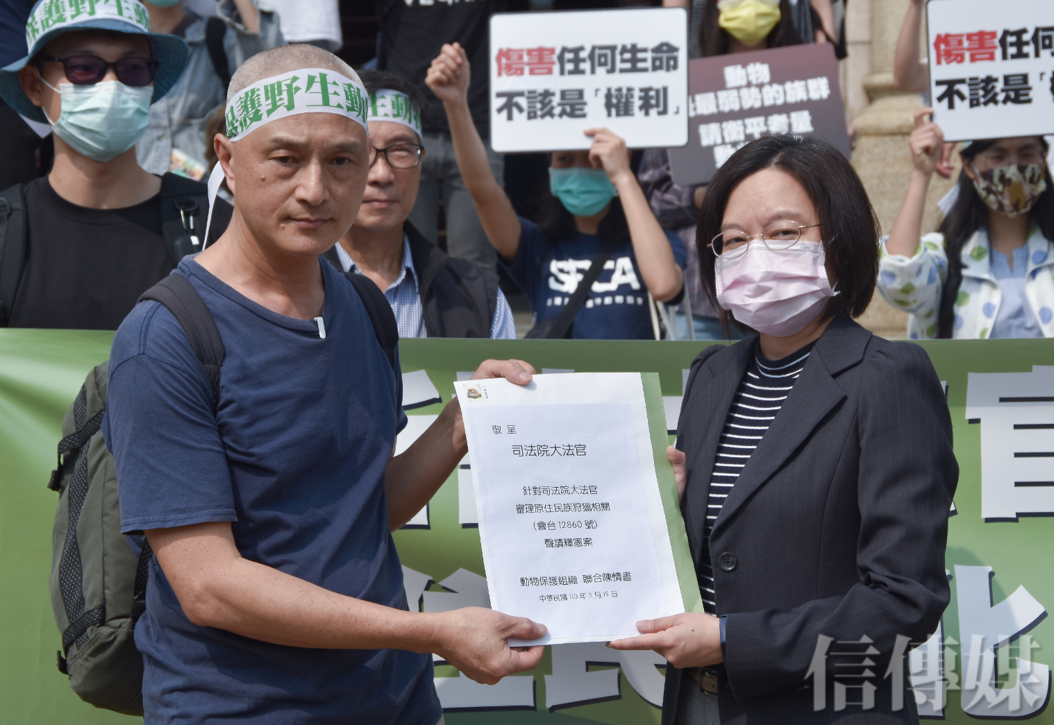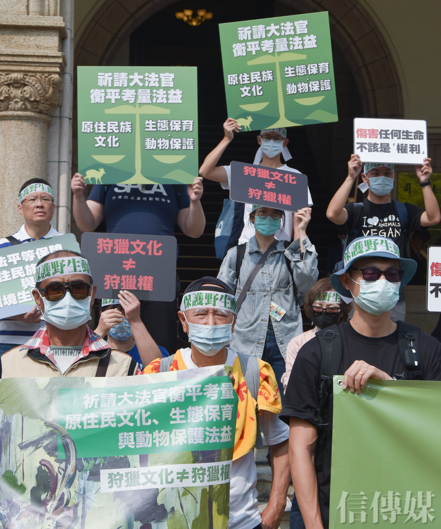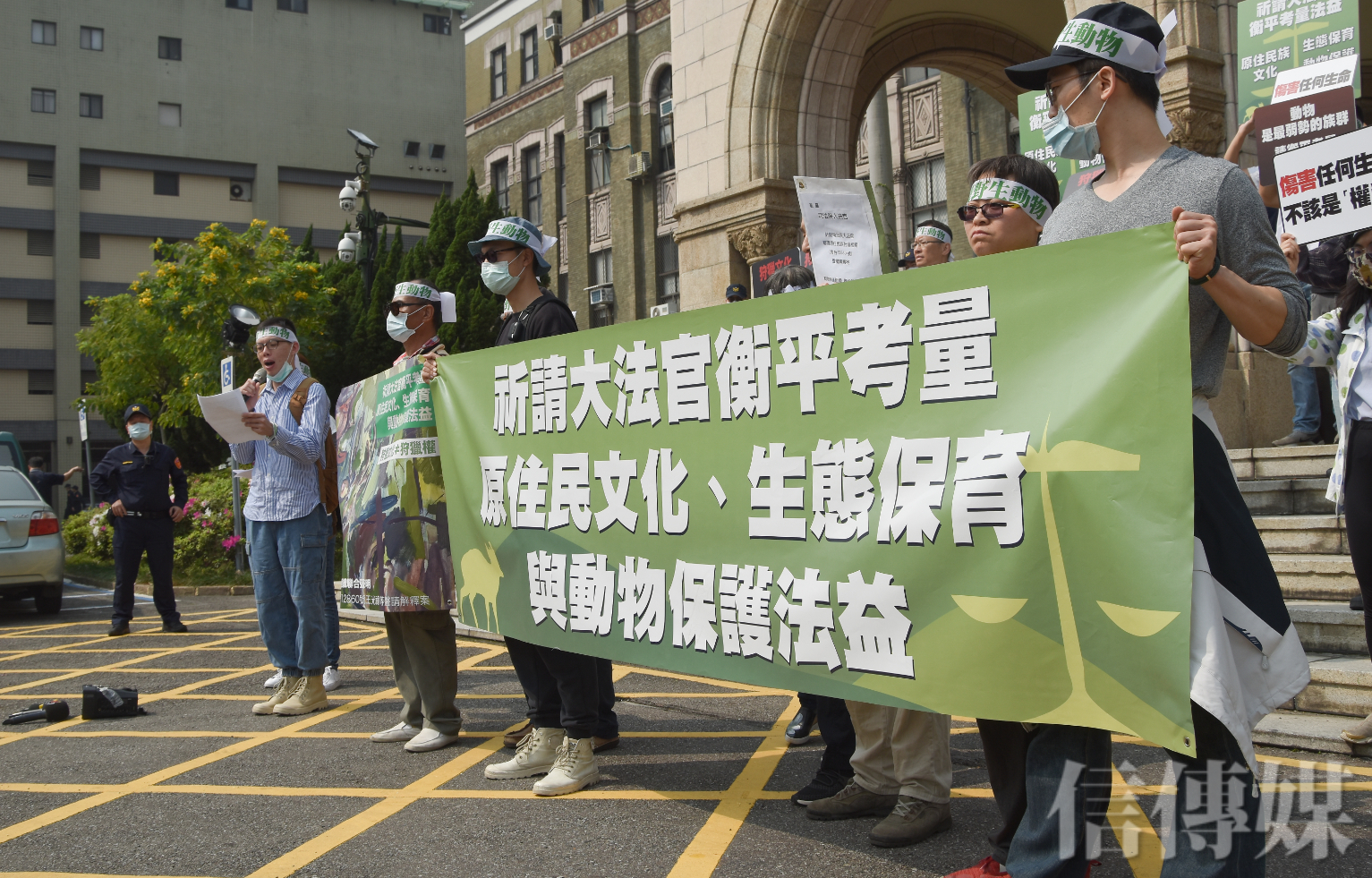 不過這樣的說法卻引發逾50個動物保護組織共同連署,提出5項訴求,聲明「狩獵文化」不等於「狩獵權」,請求大法官衡平考量原住民文化、生態保育、動物保護法益,並於今日到司法院陳情,喊口號「不犧牲動物保育」、「動物是弱勢族群」。