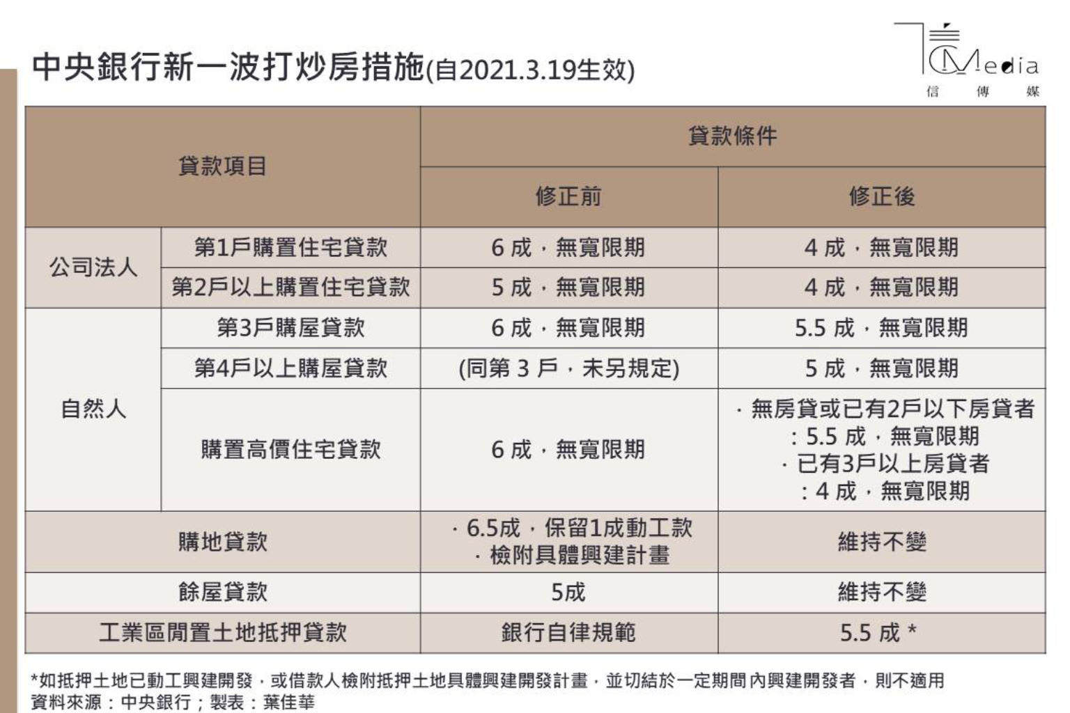 事實上,自去年央行祭出「限貸令」打炒房措施後,立法院也三讀通過實價登錄2.0、紅單納管,預訂今年7月1日上路;除此之外,金管會強化房貸稽查機制、財政部也提出房地合一稅2.0修法,沒想到央行才施行一季的「限貸令」,眼看成效有限,又再度出手調降貸款成數。