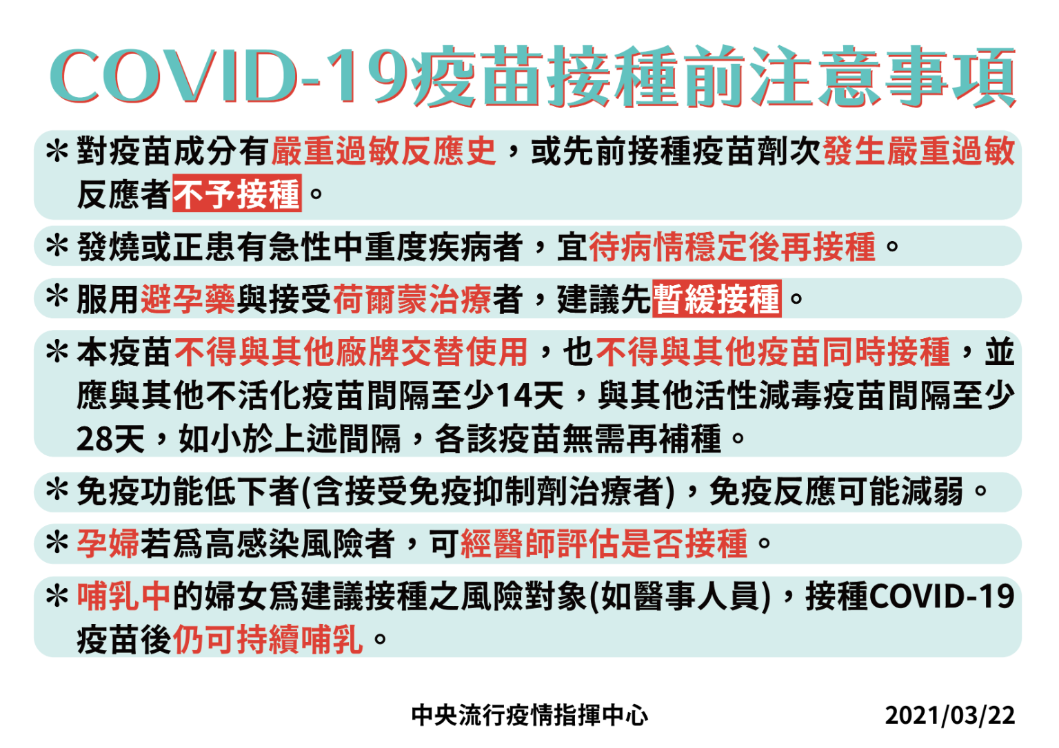 COVID-19疫苗接種前注意事項。(圖片來源/中央流行疫情指揮中提供)