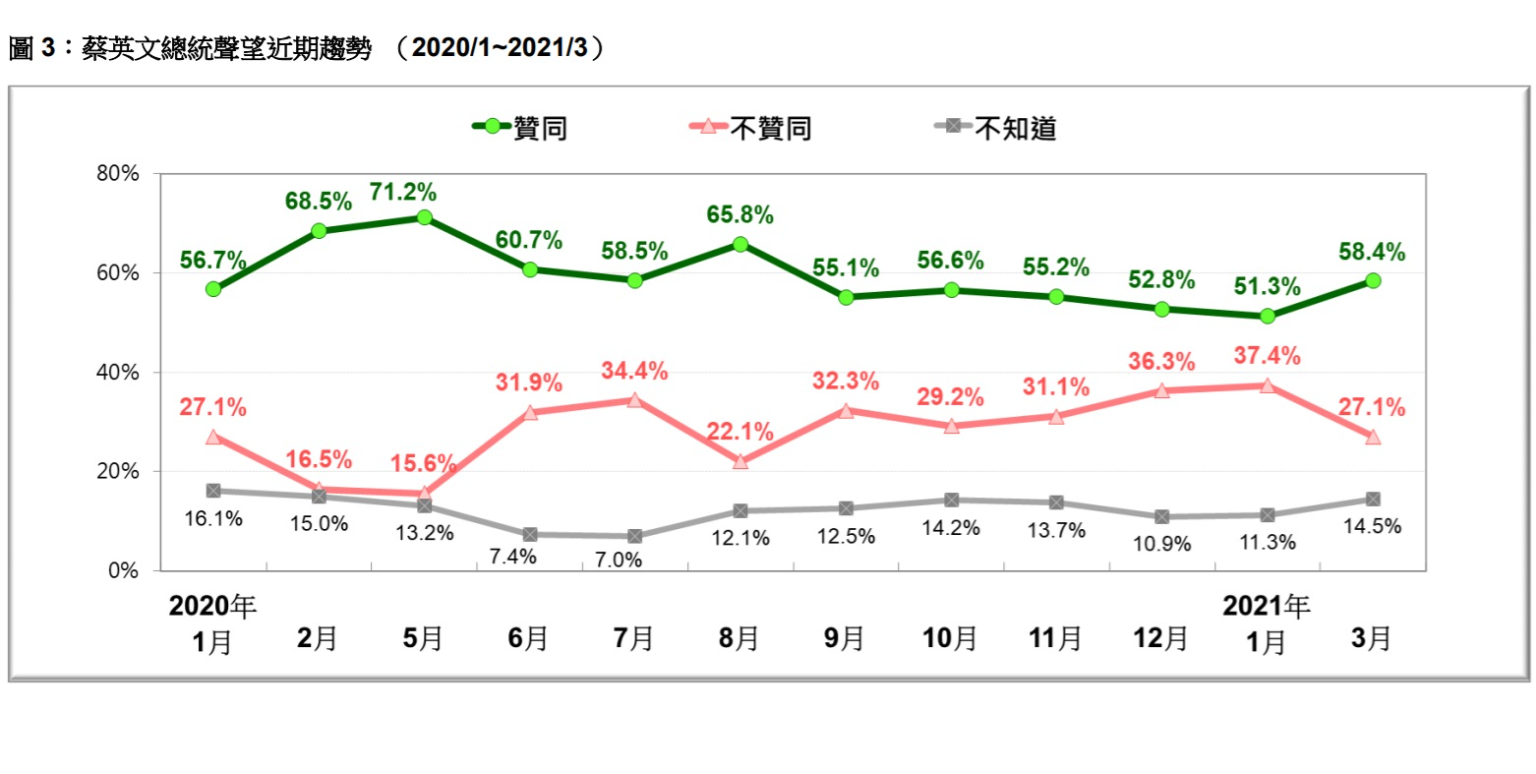 儘管如此,在藻礁公投如火如荼進行的期間,蔡英文總統的贊同度仍從1月的51.3%上升到58.4%,不贊同度則從37.4%下降至27.1%,顯然未明顯受到影響。同一時間,行政院長蘇貞昌內閣的施政滿意度,亦從去年12月的51.4%上升到54.4%,施政不滿意度則從40.9%下降到33.1%。