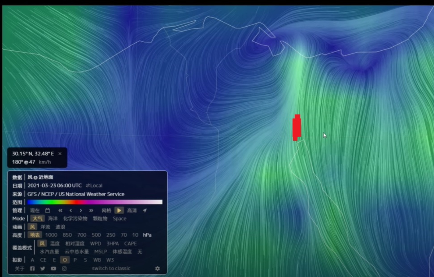 但是國外推特帳號如《財經真相》表示,根據氣象軟體還原埃及時間3月23日當天事發地點,近一百公里內風向持續由南向北吹。