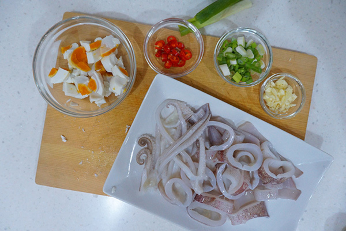 將鹹蛋剝殼切碎、中卷切圈,辣椒、蔥切粒切段,大蒜切末。