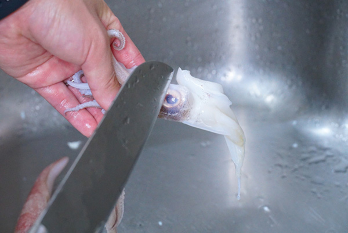 補充中卷前處理,一定要將眼睛切刀擠出清除,口感才會好喔。