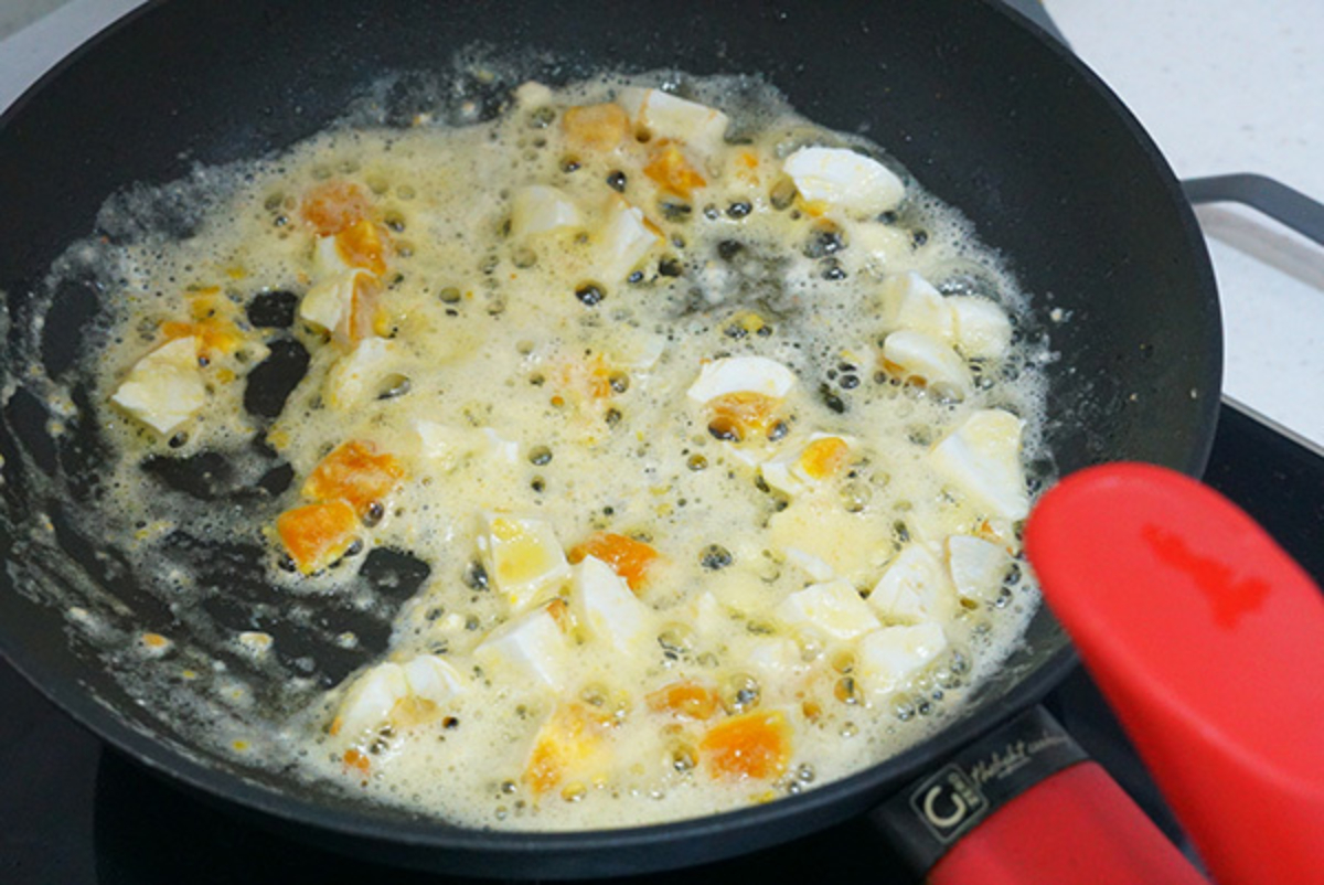 加油熱鍋後,下放入鹹蛋爆香,中大火炒出泡沫。