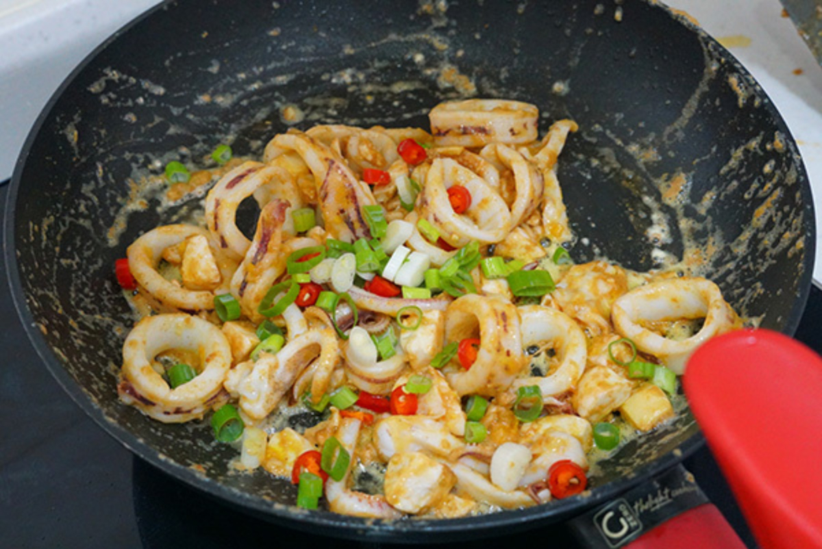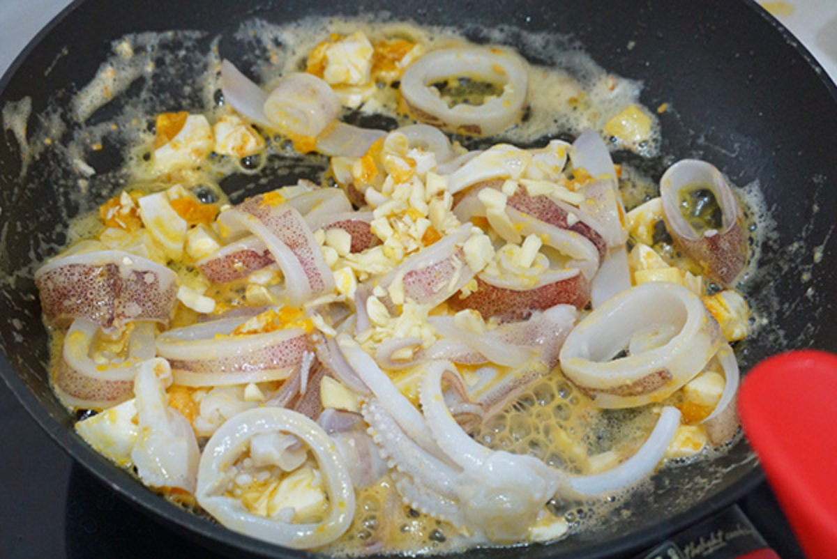 中卷炒熟鹹蛋也呈現較乾狀,加入白胡椒、蔥花、辣椒調味後即可起鍋。