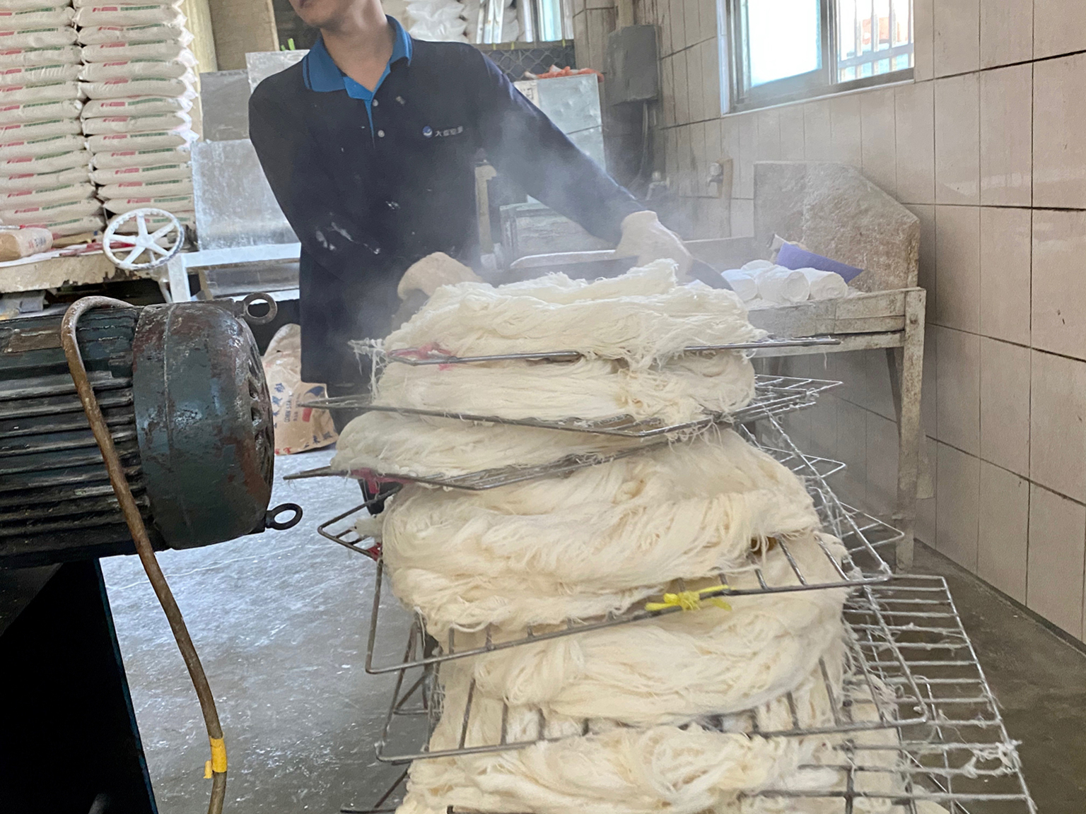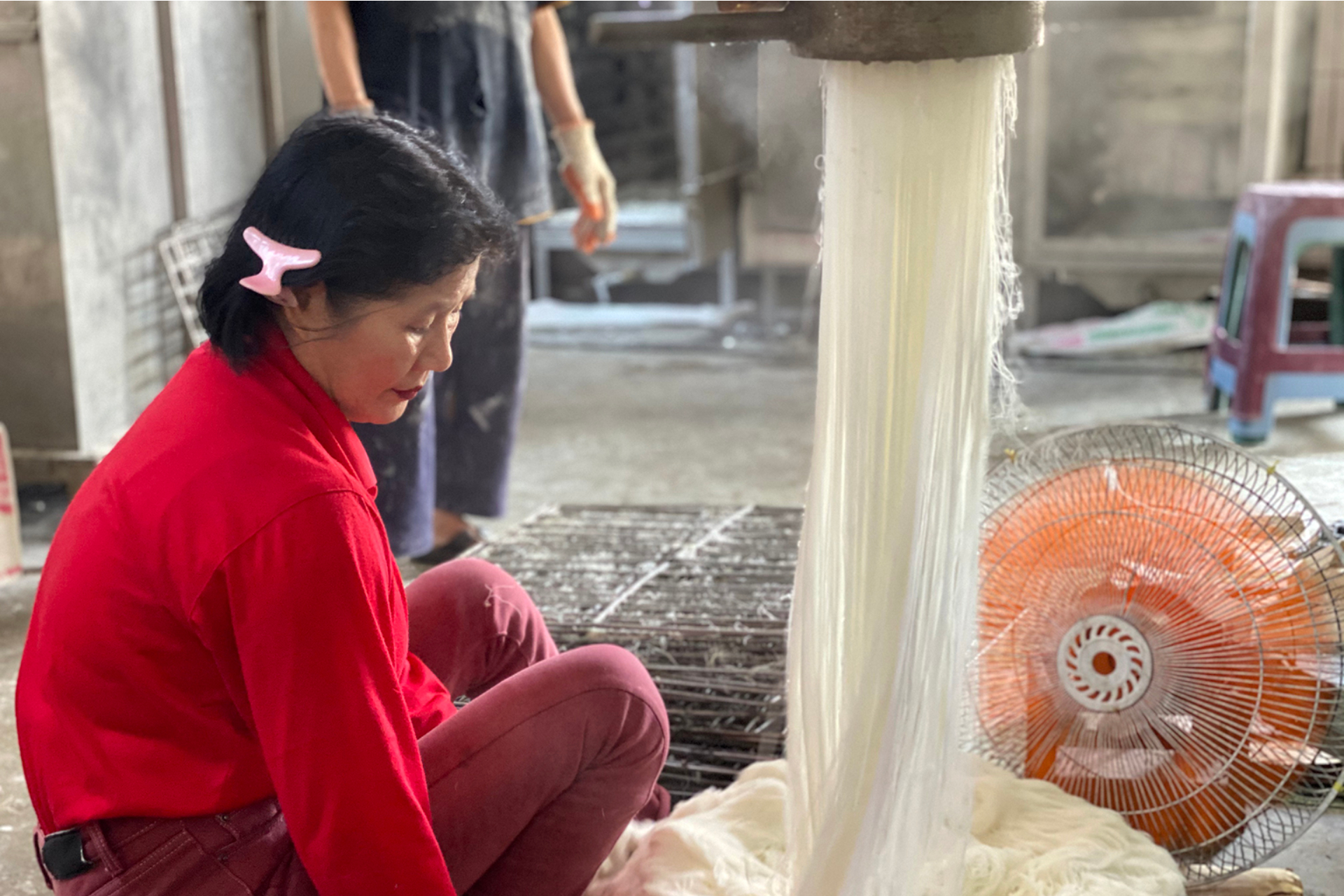 重複動作,一一送入高塔蒸籠,裝滿。最後啟動大火,炊蒸之際,最是美麗迷離的畫面,廠內廠外盡是白煙,如置身煙霧繚繞的深山。等到五分熟的米粉熟透,便是一坨一坨米粉團,倒在長桌上攤開,接手人以按摩的手勢讓米粉們鬆開,彼此不打結。我安靜地錄影,看著他們忙碌卻熟稔的動作,像是默劇,一切都悄然在米粉散發的白煙裡。這樣的畫面一路持續130年,不懈,驚人的紀錄。