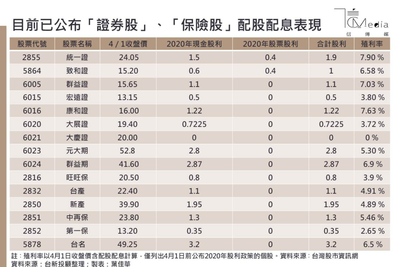 攤開目前已公布2020年股利政策的30檔金融股中,截至4月1日收盤前統計,以統一證殖利率7.90%最高,另外,包括群益證、康和證殖利率也都超過7%。