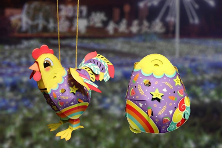領小提燈是親子遊燈會必走的行程之一,今年幸福奇雞小提燈限量8萬盞,每日發放數量有限,每人限領一盞。特別的點是今年史無前例結合了「雞」與「蛋」兩種造型,運用巧思創造出既可摺成雞又可收成蛋的提燈,將「雞生蛋,蛋生雞」的概念,帶到設計之中,創造出一個另類的「變形金剛」提燈。