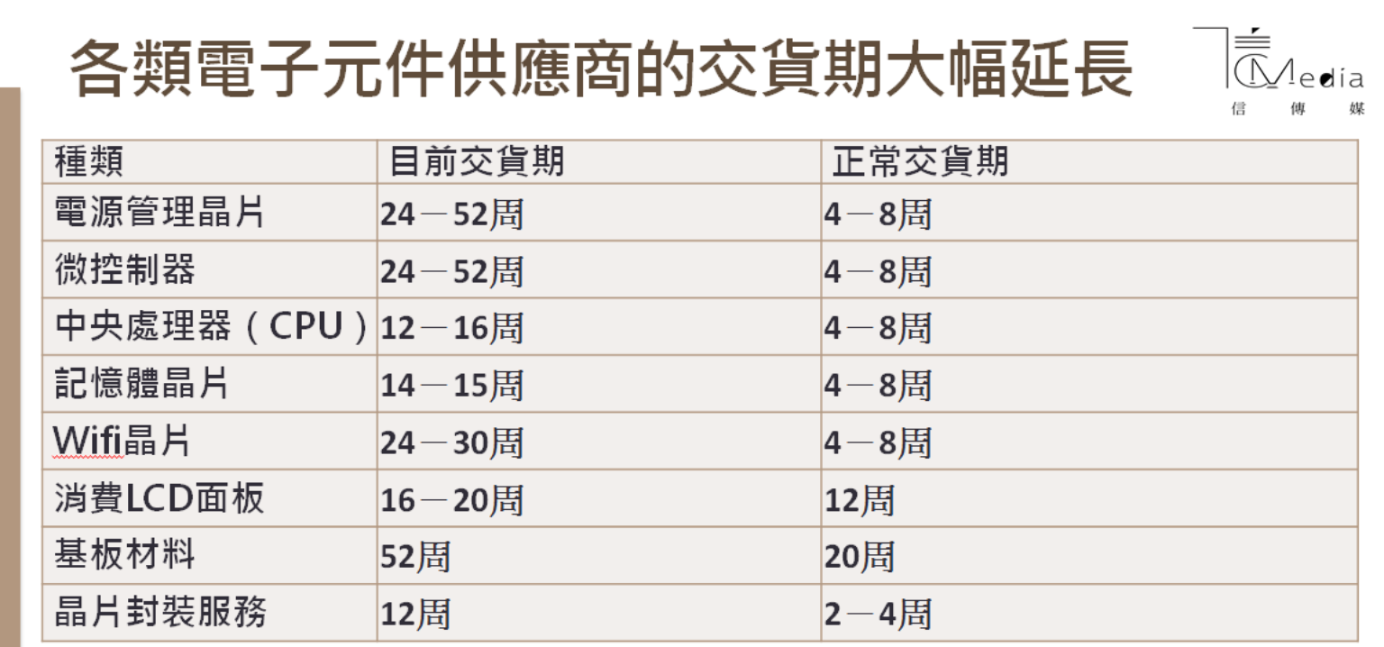 大流行還帶動「宅經濟」和居家上班的筆電、PC、平板電腦等需求,5G網路設備和智慧手機也需要更多晶片和零組件。