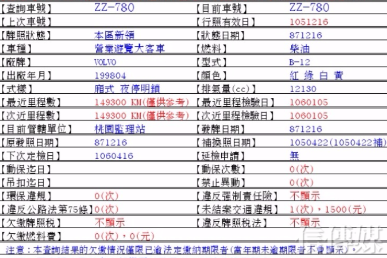 國道3號在2月13日晚間9時發生重大車禍事故,導致至少32人不幸身亡,公路總局表示,事故遊覽車為友力通運有限公司所有,車號ZZ-780,1998年4月出廠,車齡約19年,根據監理單位紀錄車型為VOLVO B-12,柴油車,參考里程數達到149300公里,最近只有一筆交通違規遭罰1500元。