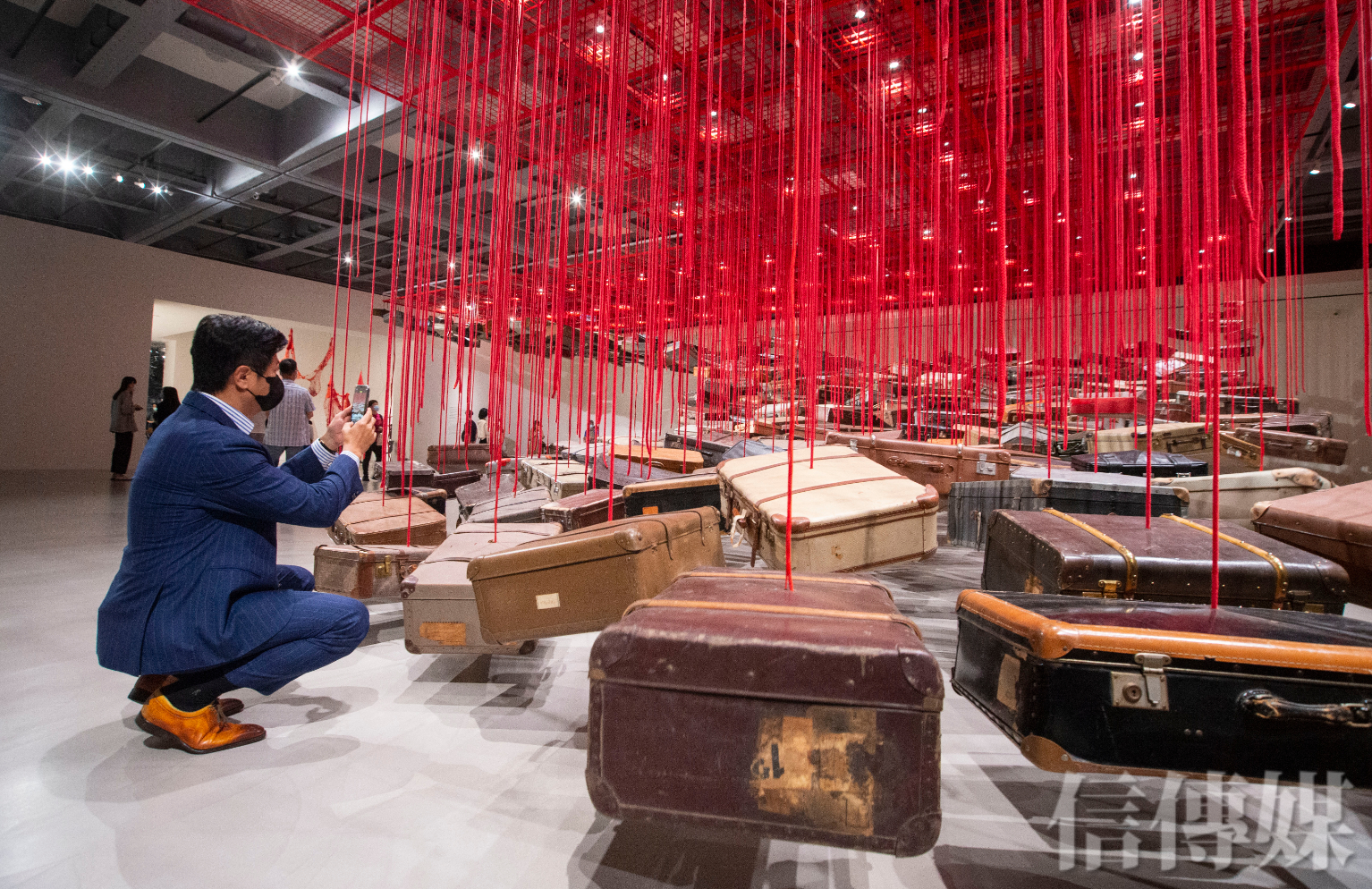 一進入展場內,密密麻麻的老舊行李箱漂浮在空中,塩田千春收集了各種舊物,認為創作是「編織它們的故事和回憶」,尋找「不在中的存在」。
