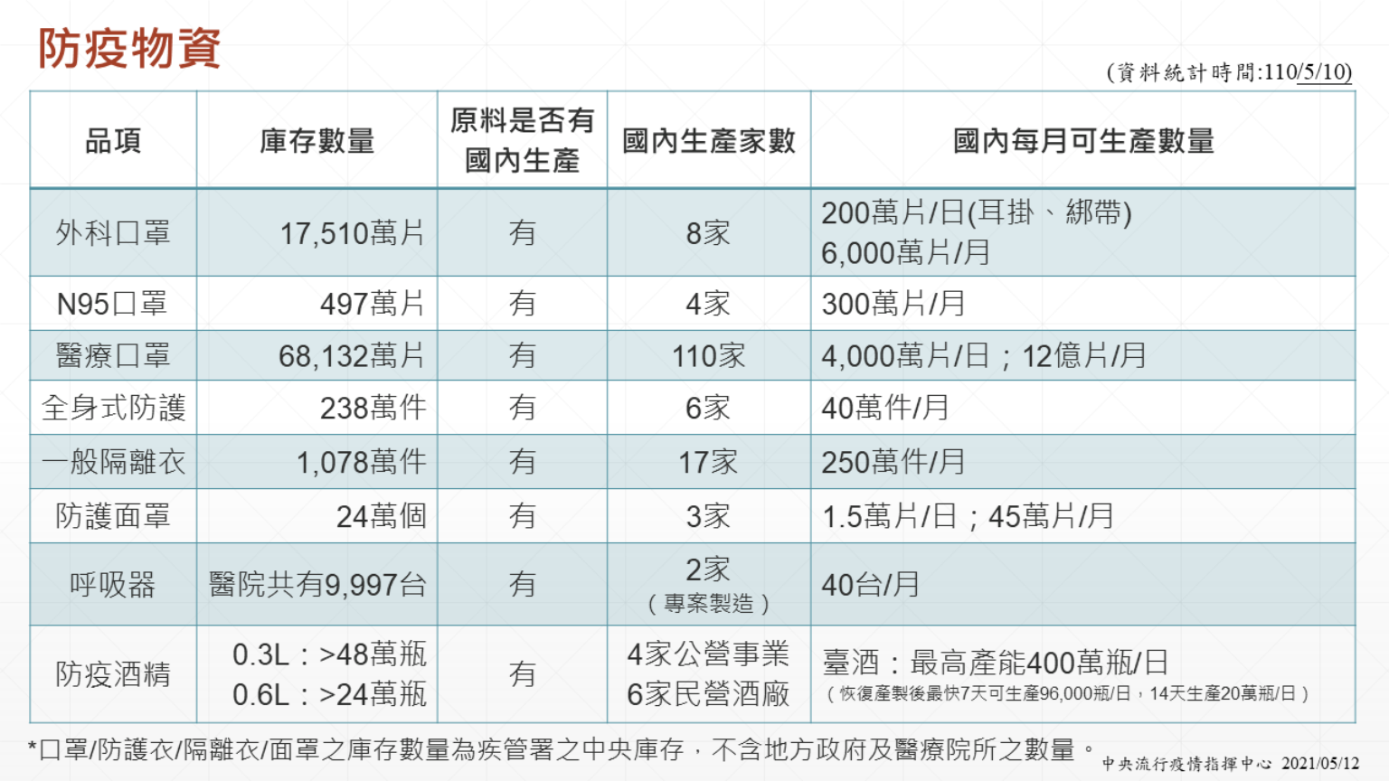 針對蔡總統稱「目前防疫物資、醫療系統充足」,陳時中今天明確列出各項防疫物資的庫存數量,包含醫療口罩共6億8,132萬片、一般隔離衣1,078萬件、呼吸器9,997台...等。