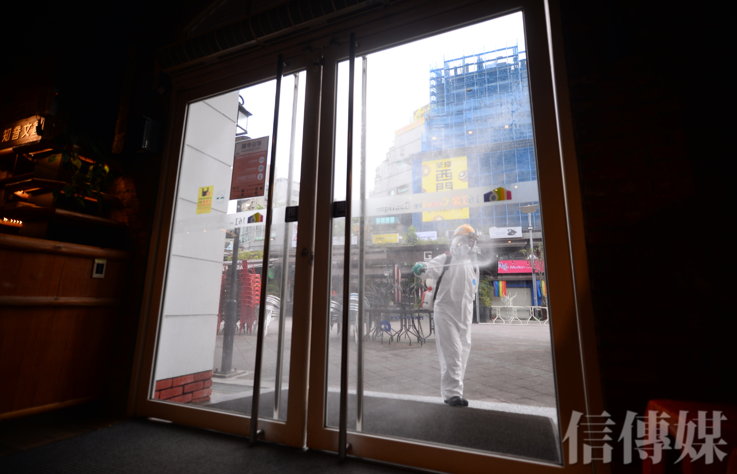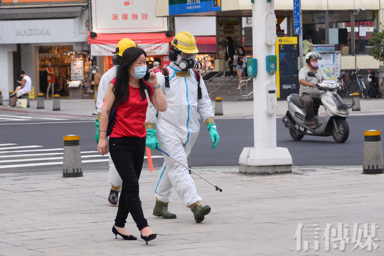 確診足跡公布後,台北市萬華龍山寺週邊、西門紅樓等鬧區在下午進行緊急大消毒,負責清消的環保局人負全副武裝,穿著隔離衣和防毒面罩整隊進行清潔消毒作業。